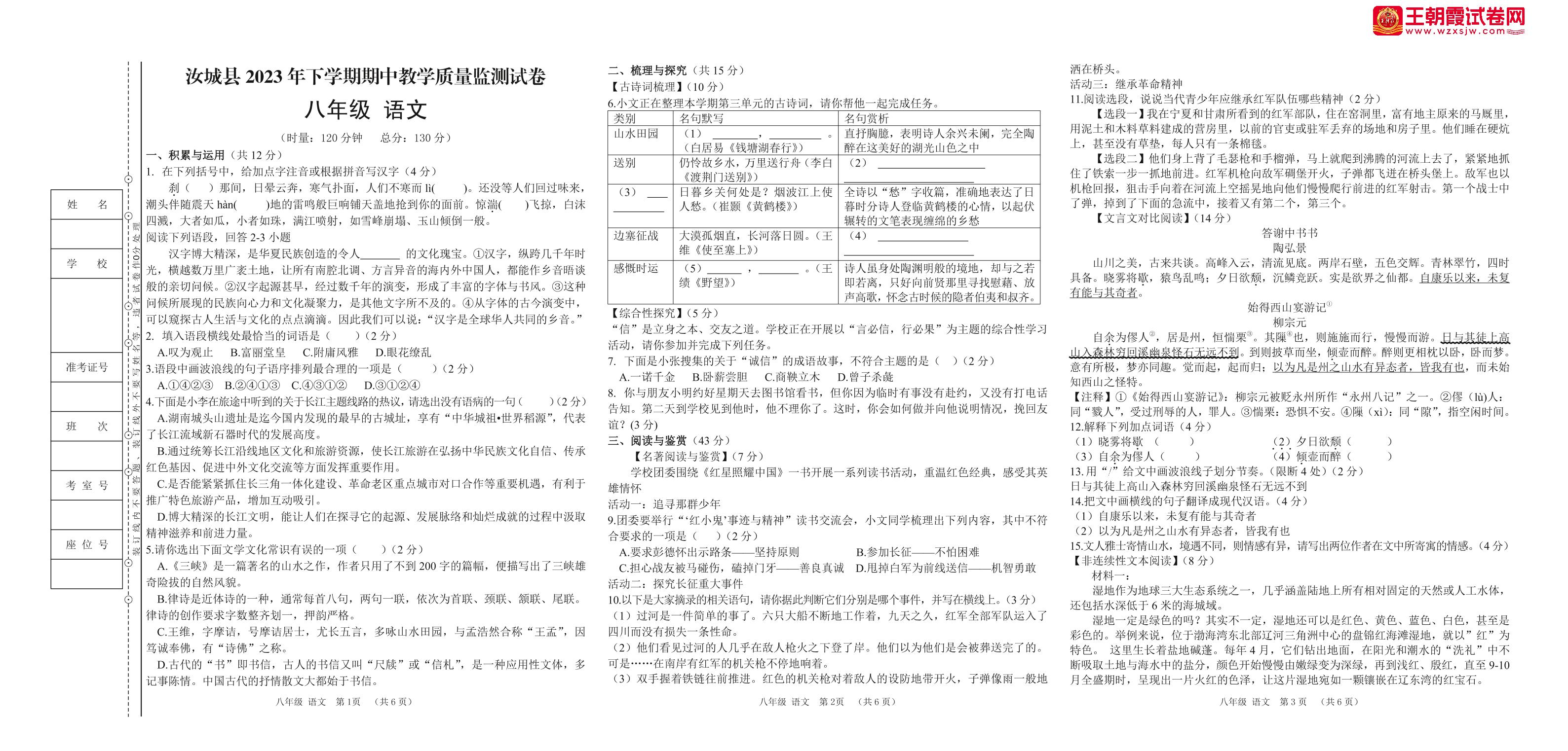 湖南省郴州市汝城县2023-2024学年第一学期期中教学质量监测试卷八年级语文(人教版)