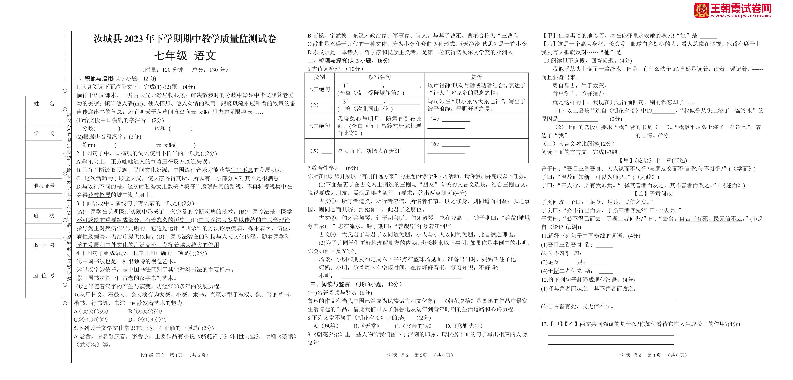 湖南省郴州市汝城县2023-2024学年第一学期期中教学质量监测试卷七年级语文(人教版)
