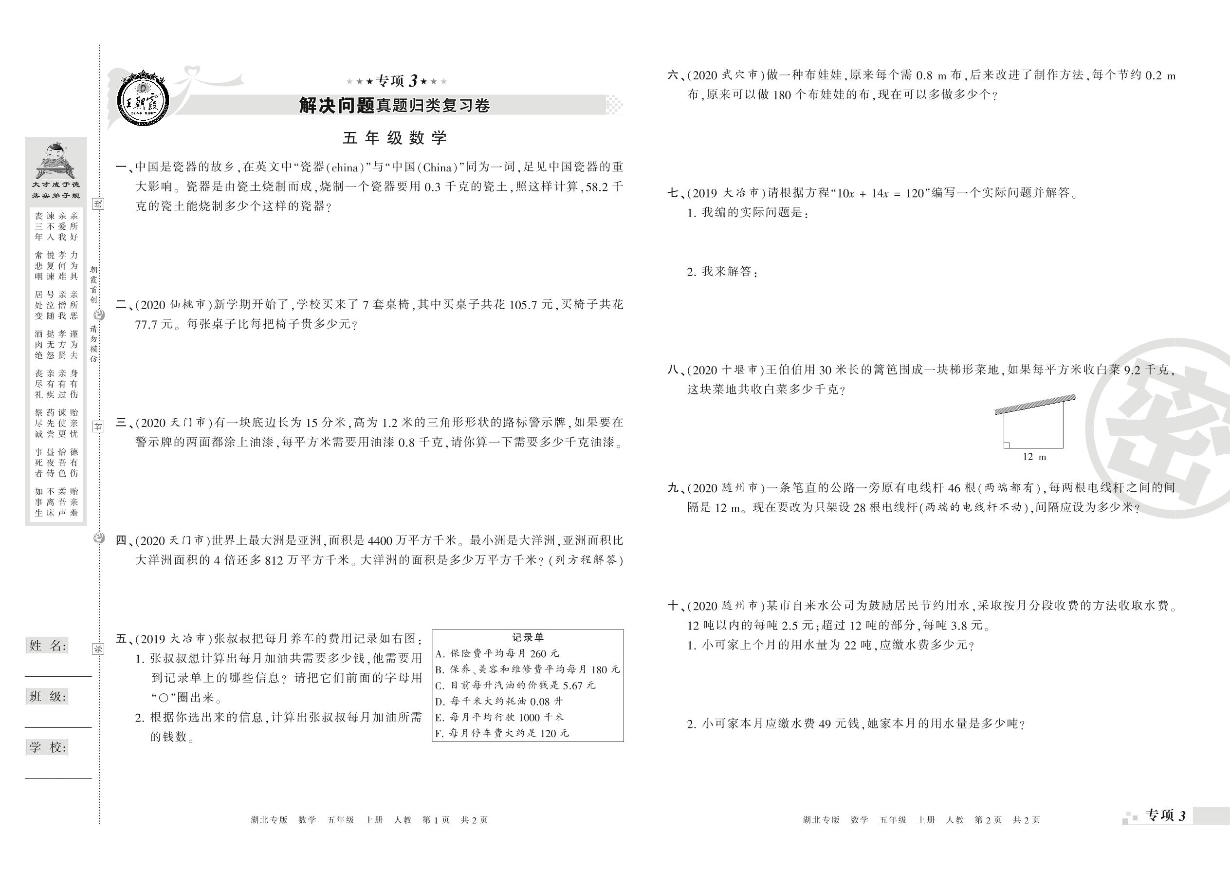 王朝霞期末专项卷——解决问题真题归类复习、新颖题速递:生活与数学五年级上册数学(人教版)_R210804165038【0】