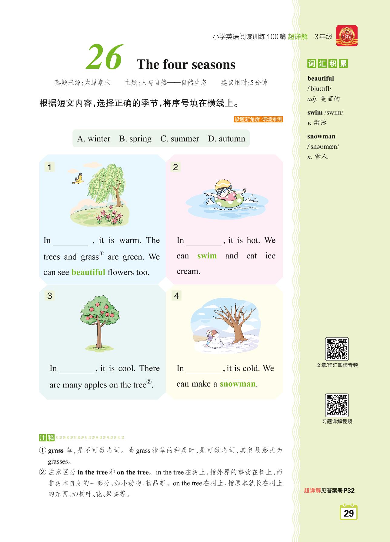 三年级英语阅读超详解 Part1 青铜篇:26 The four seasons