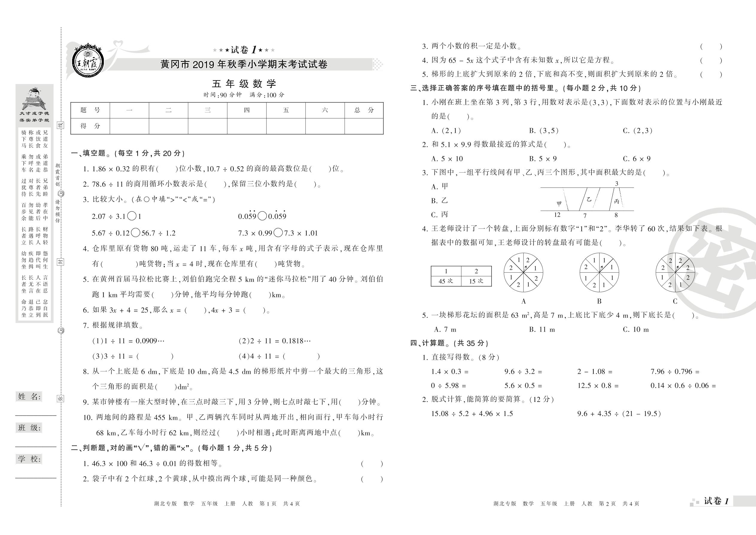 2019-2020学年第一学期黄冈市五年级数学试卷(人教版)【1】