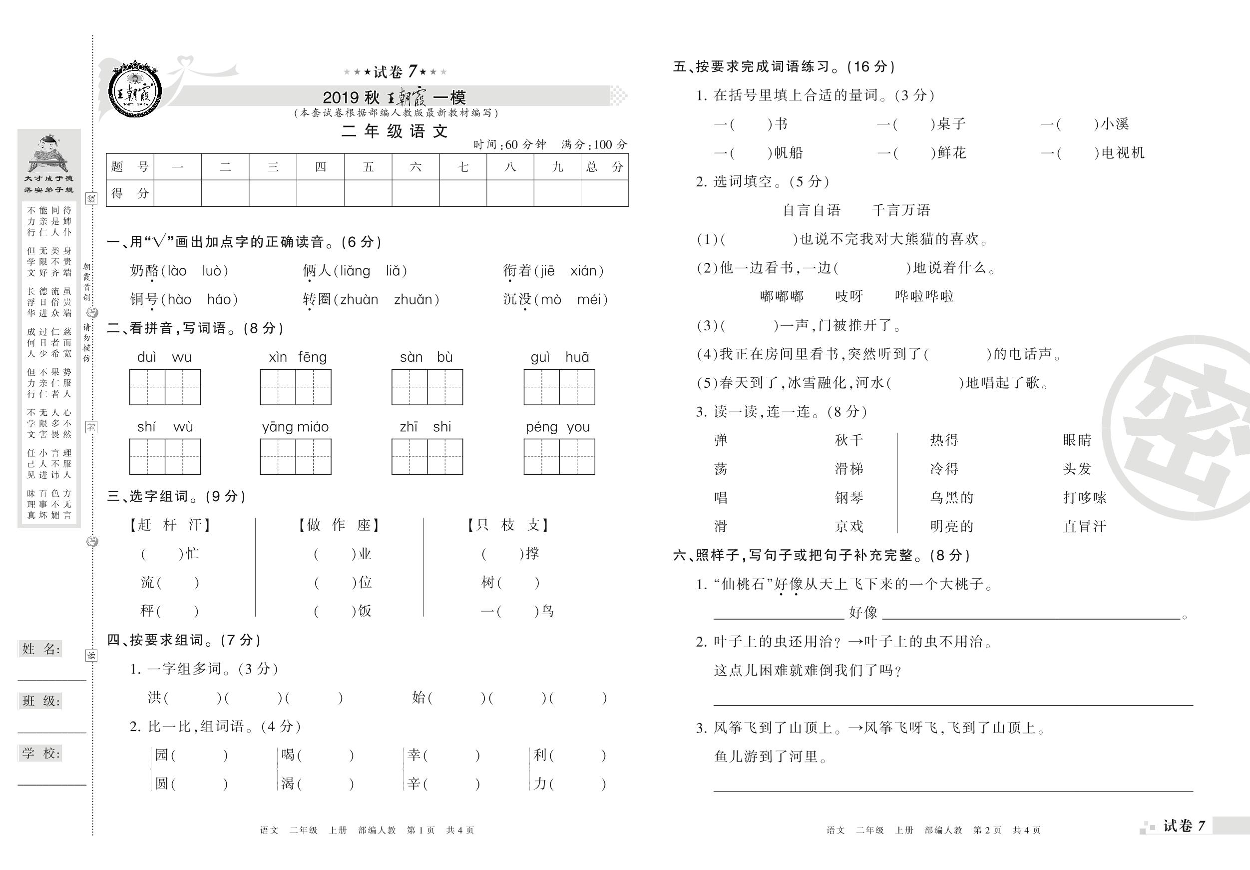 王朝霞期末模拟卷二年级上册语文(人教版)_R21080171031【7】