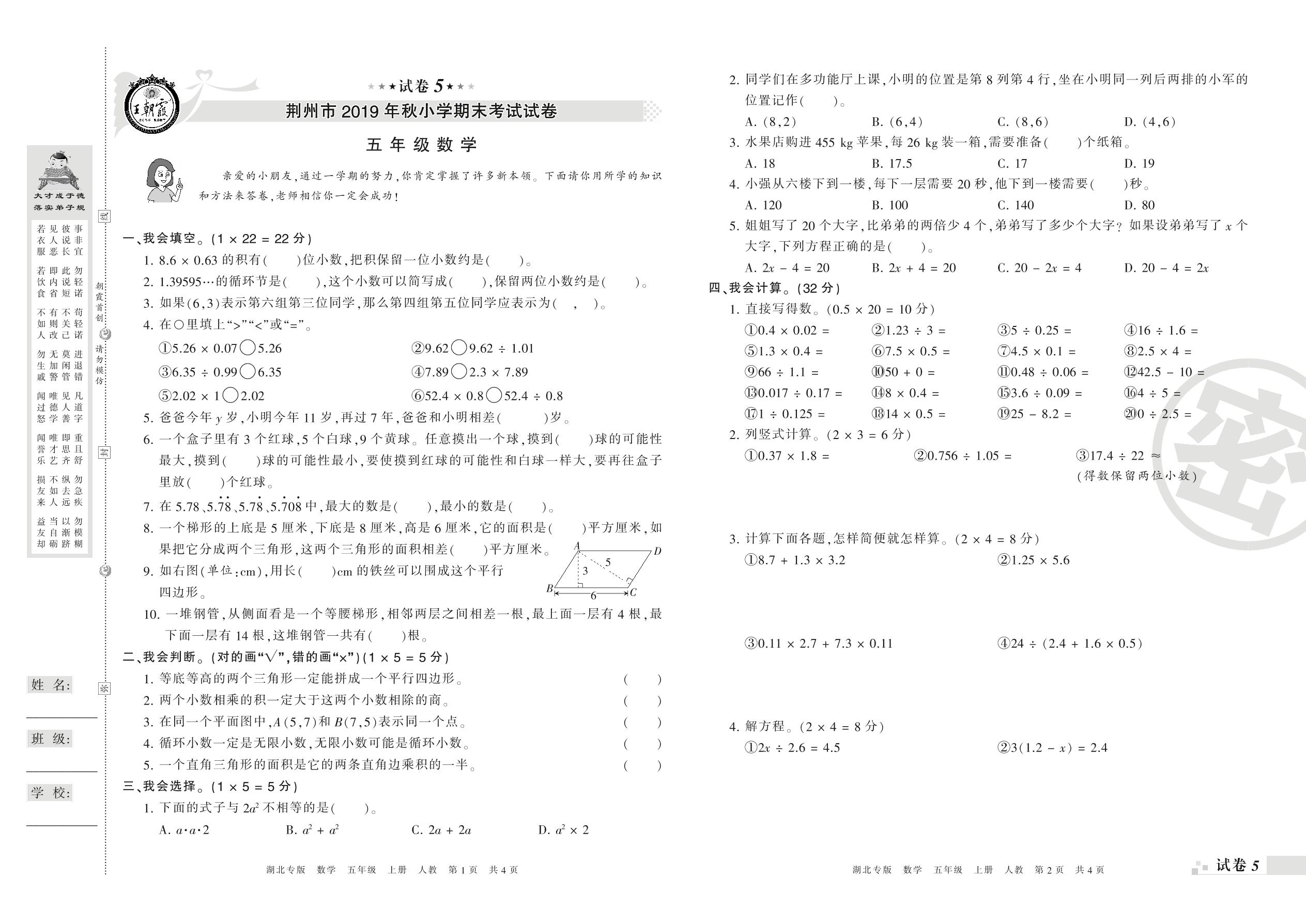 2019-2020学年第一学期荆州市五年级数学试卷(人教版)【5】