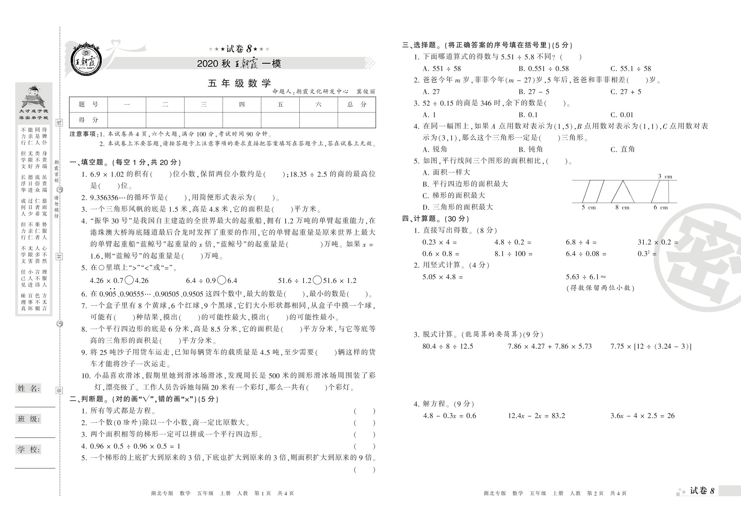 王朝霞期末模拟卷五年级上册数学(人教版)_R210804165103【8】