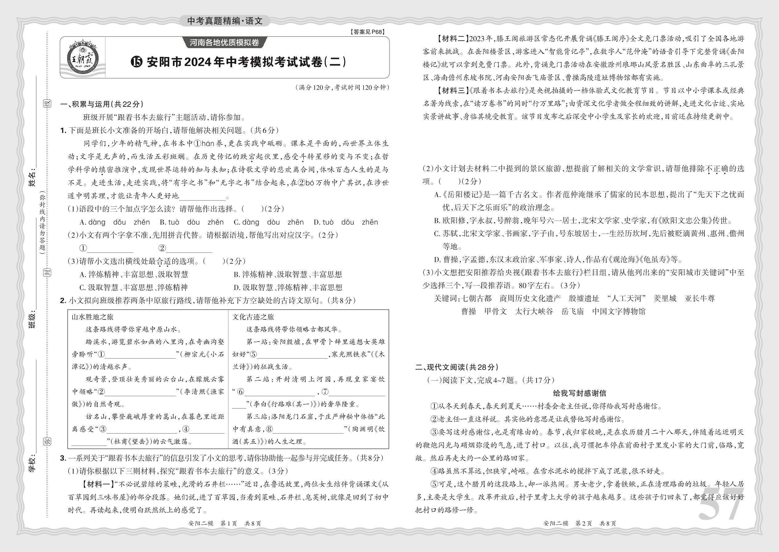 中考语文·河南省安阳市2024年中考模拟考试试卷(二)【15】