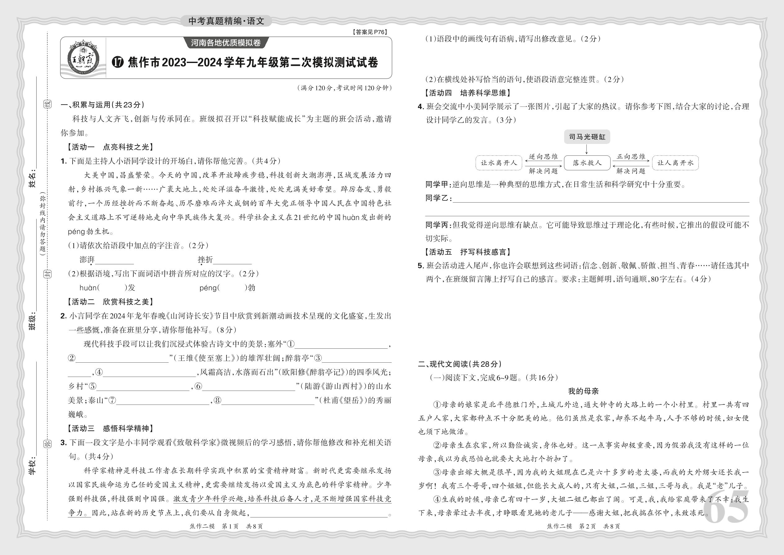 中考语文·河南省焦作市2023-2024学年九年级第二次模拟测试试卷【17】