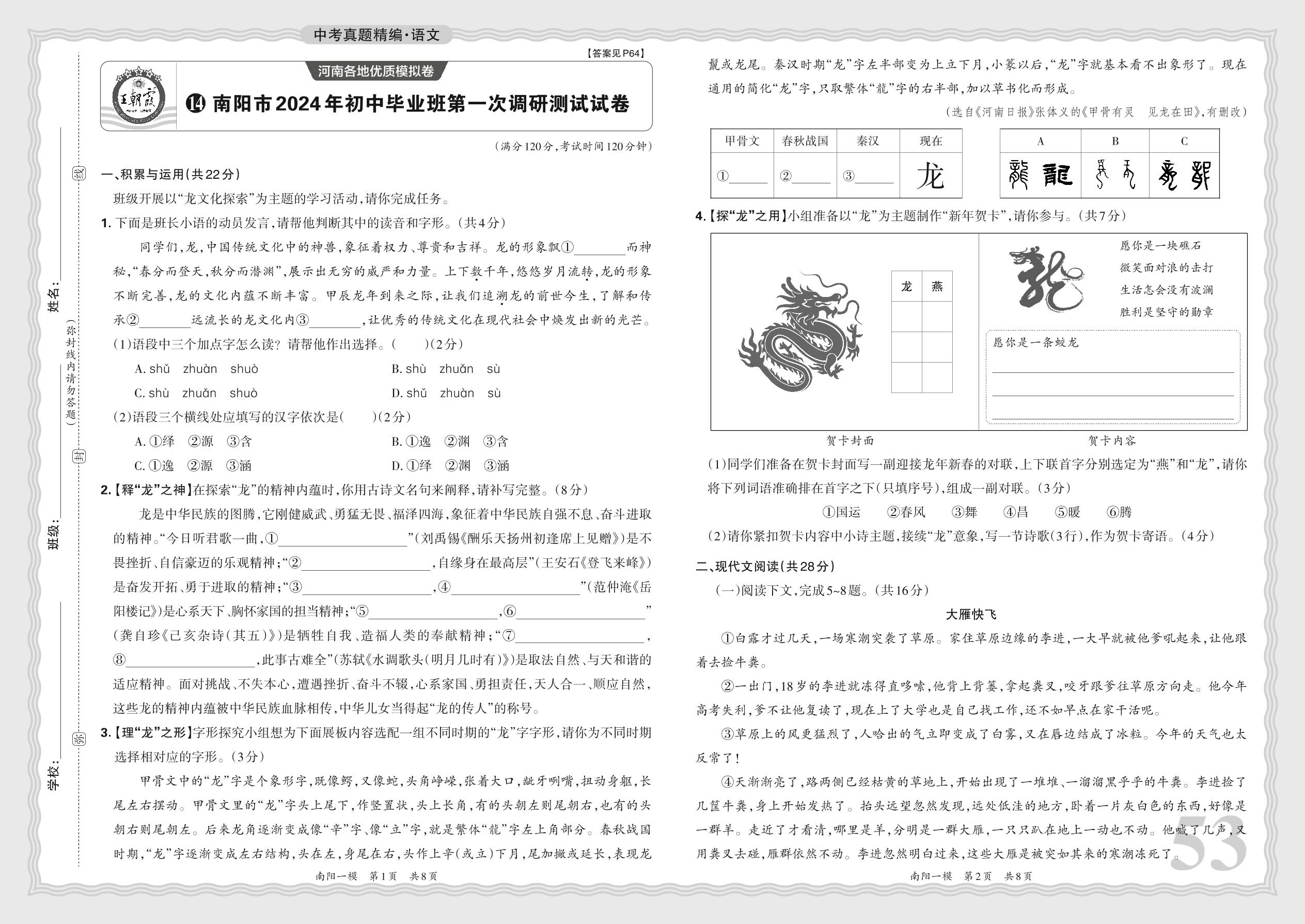 中考语文·河南省南阳市2024年初中毕业班第一次调研测试试卷【14】