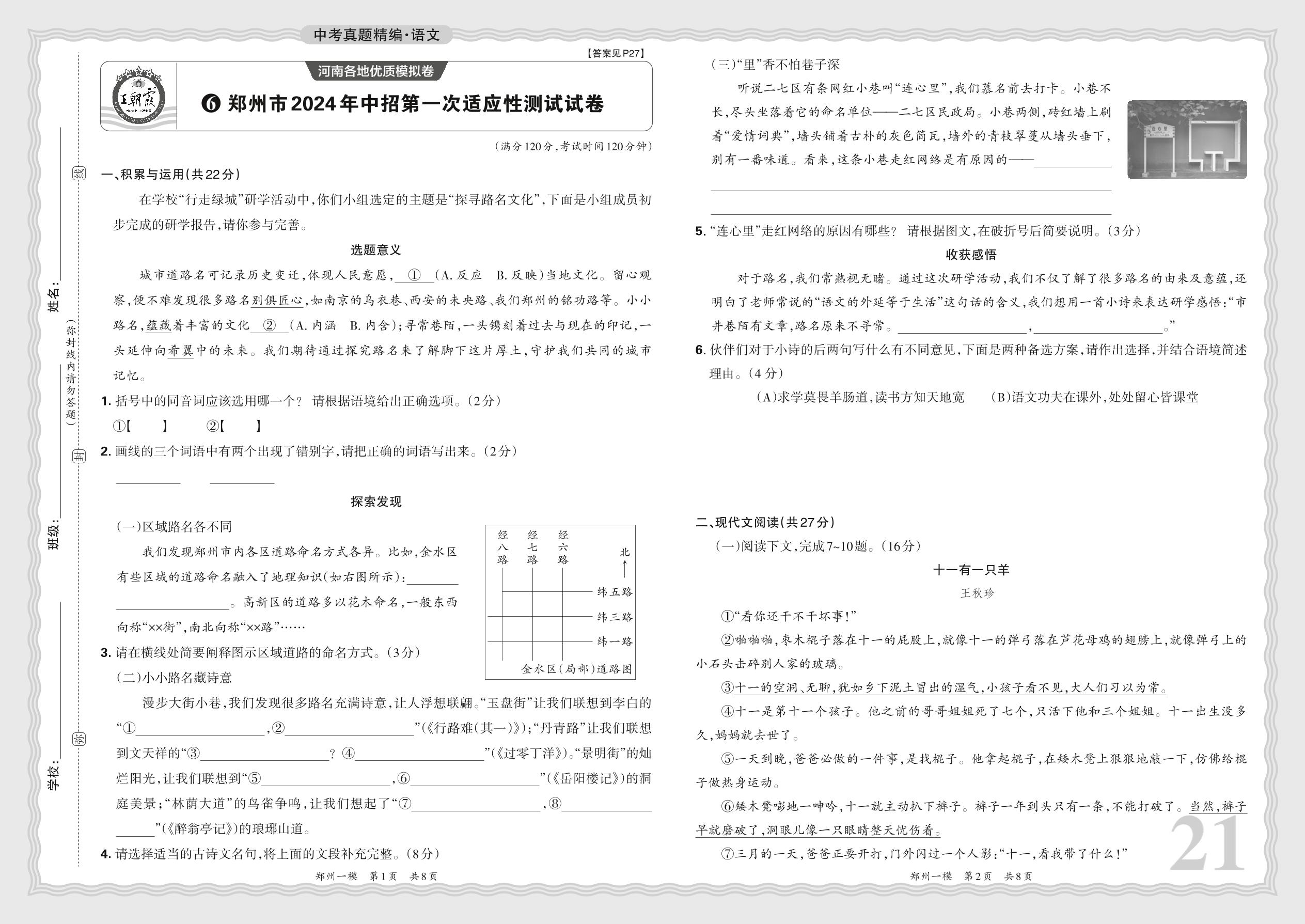 中考语文·河南省郑州市2024年中招第一次适应性测试试卷【6】