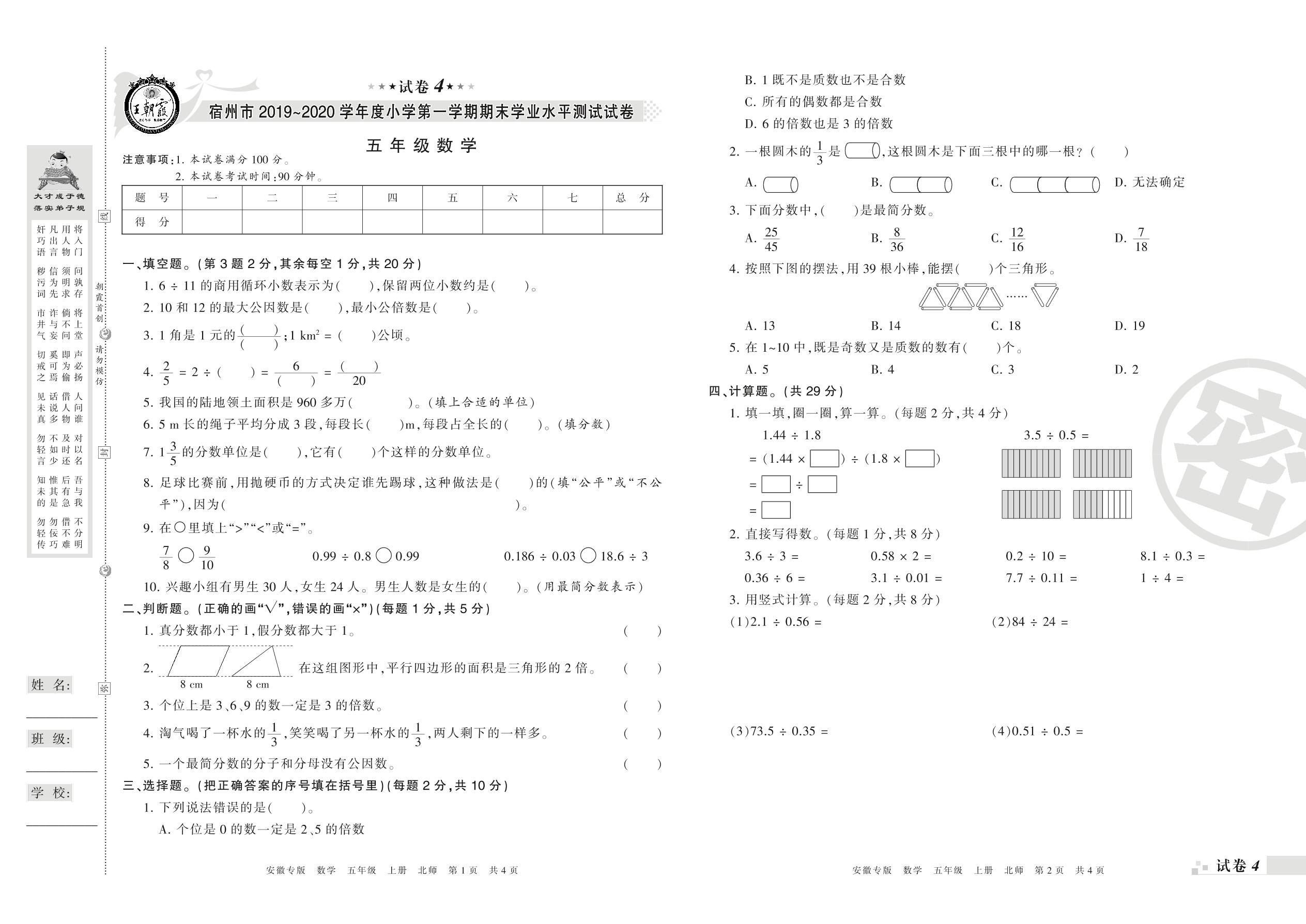 2019-2020学年第一学期宿州市五年级数学试卷(北师版)【4】