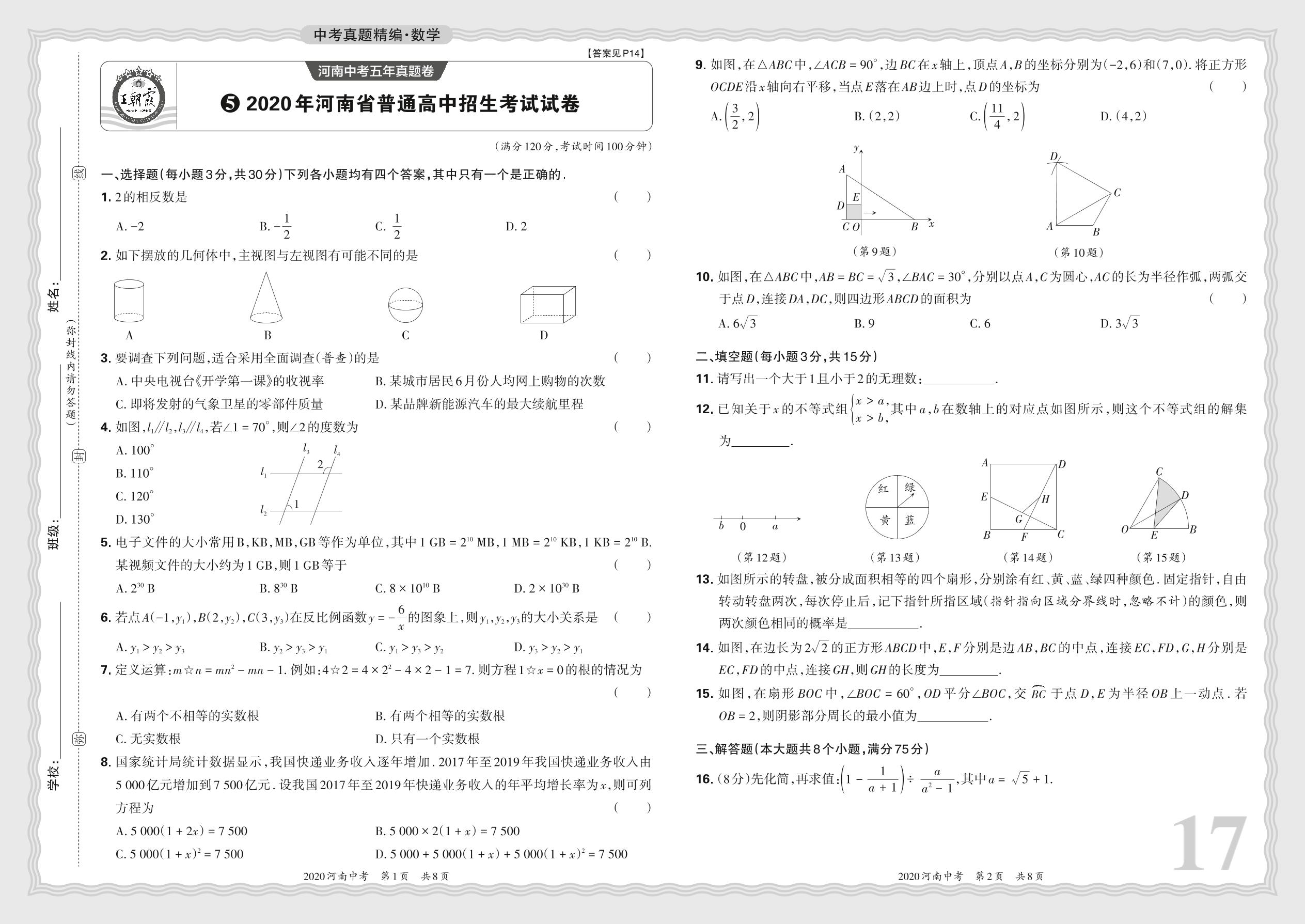 中考数学·2020年河南省普通高中招生考试试卷【5】