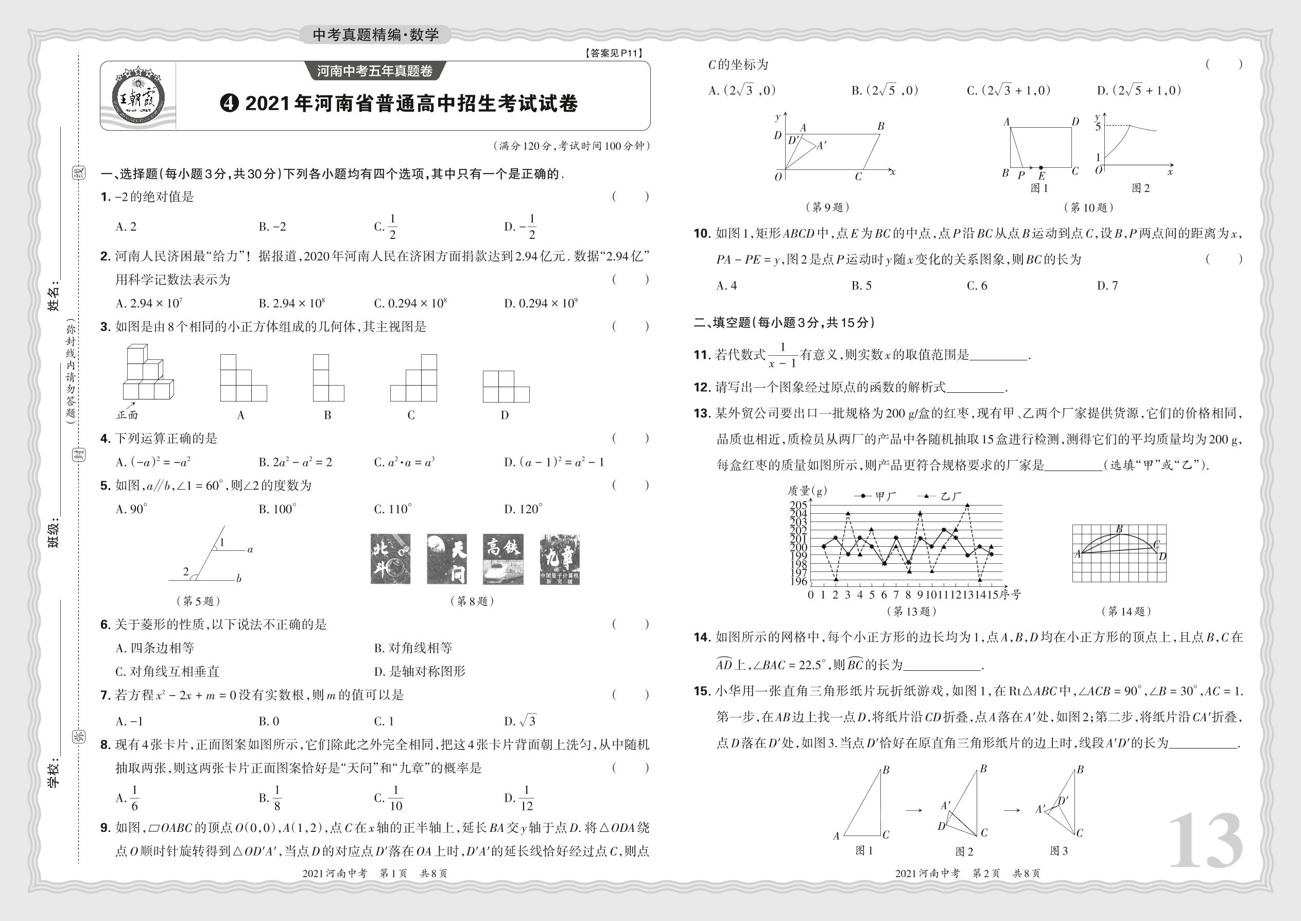 中考数学·2021年河南省普通高中招生考试试卷【4】