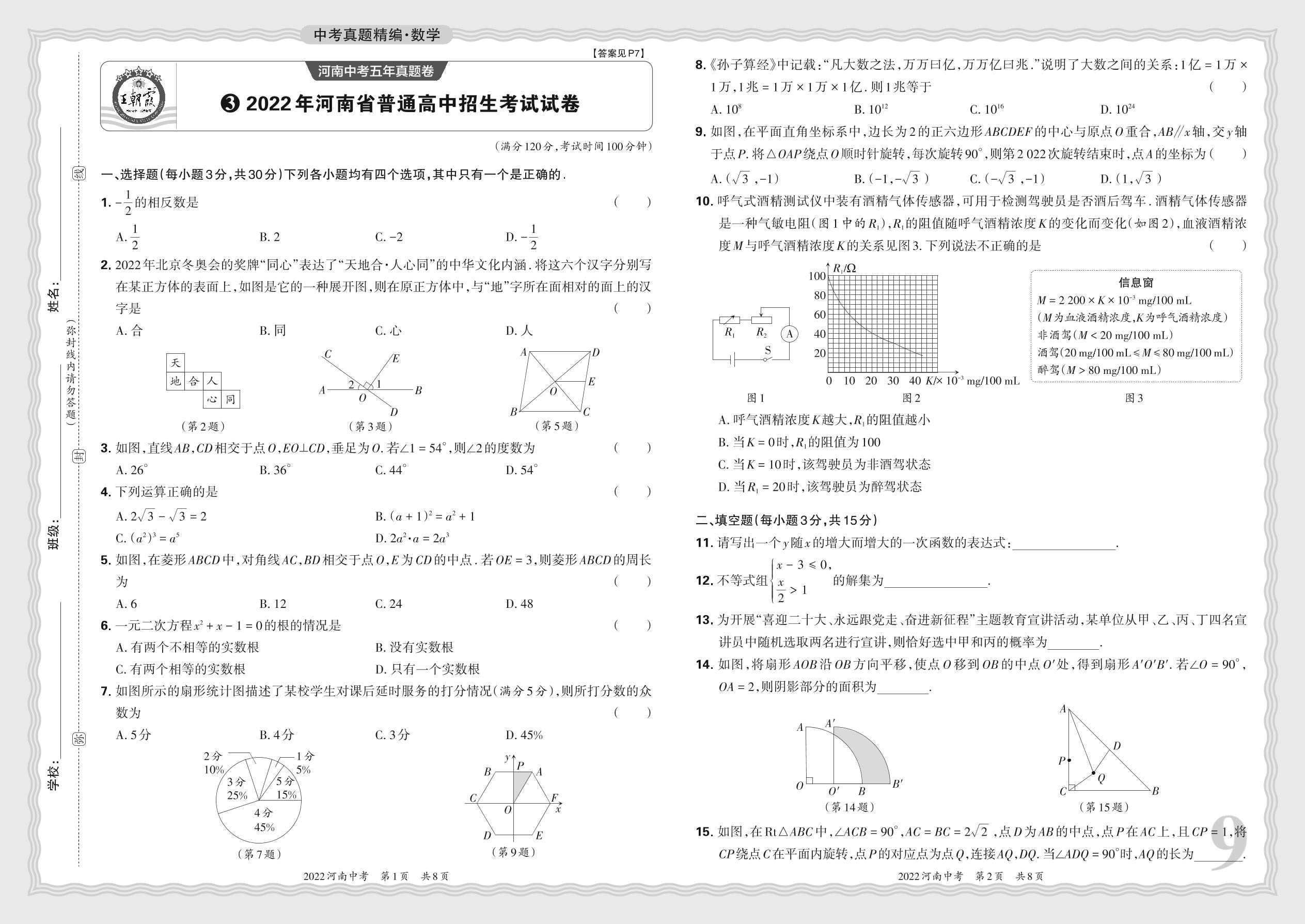 中考数学·2022年河南省普通高中招生考试试卷【3】