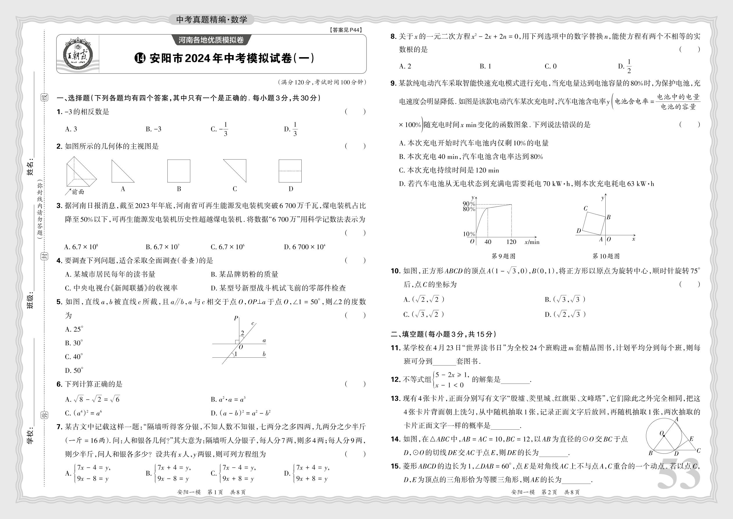 中考数学·河南省安阳市2024年中考模拟试卷(一)【14】