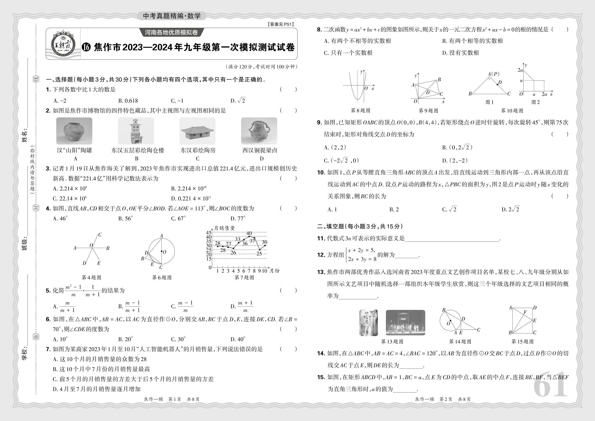 中考数学·河南省焦作市2023—2024年九年级第一次模拟测试试卷【16】