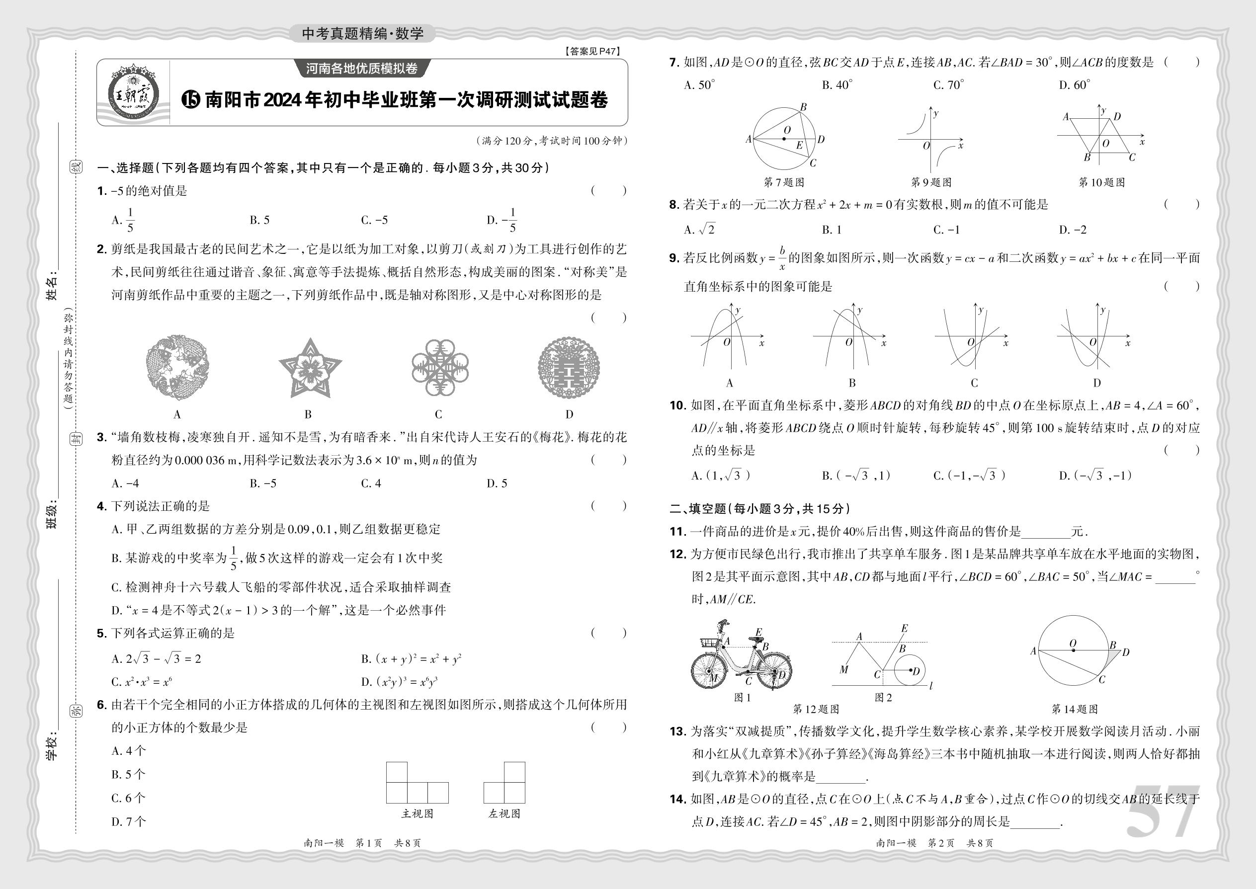 中考数学·河南省南阳市2024年初中毕业班第一次调研测试试题卷【15】