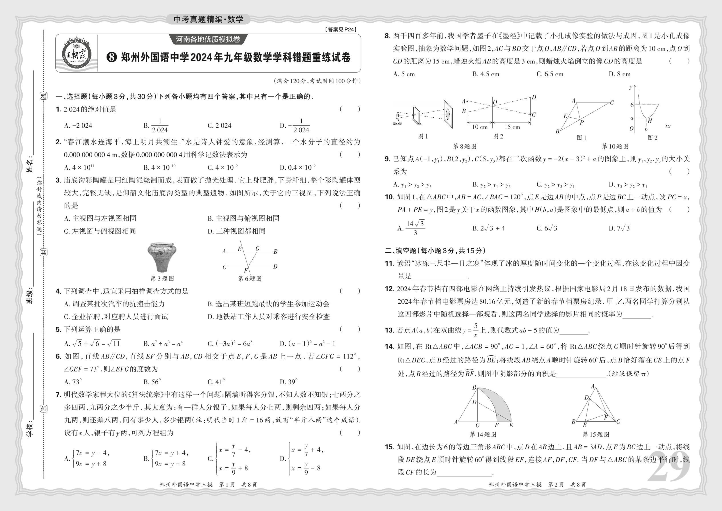 中考数学·郑州外国语中学2024年九年级数学学科错题重练试卷【8】