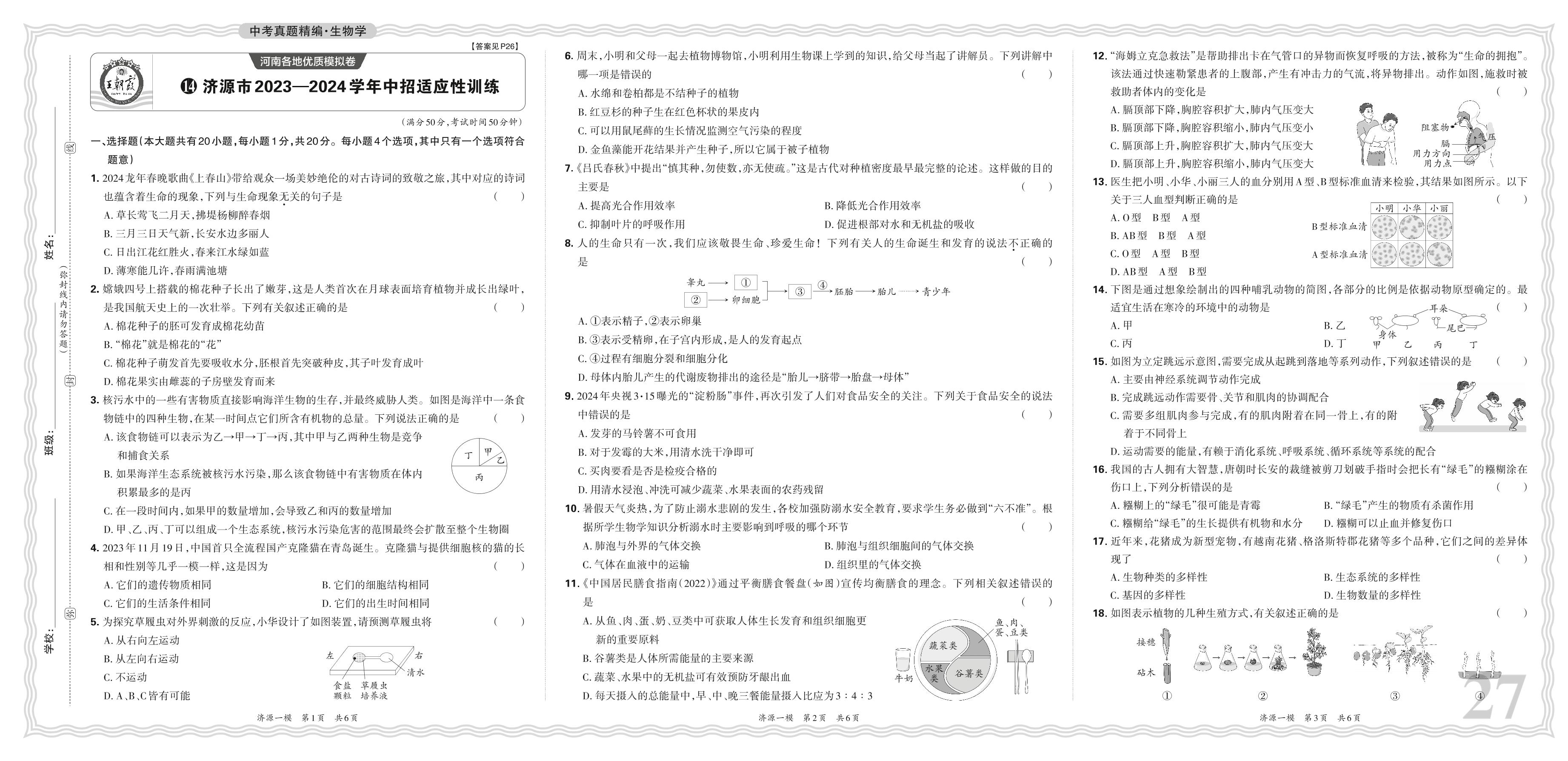中考生物·河南省济源市2023—2024学年中招适应性训练【14】