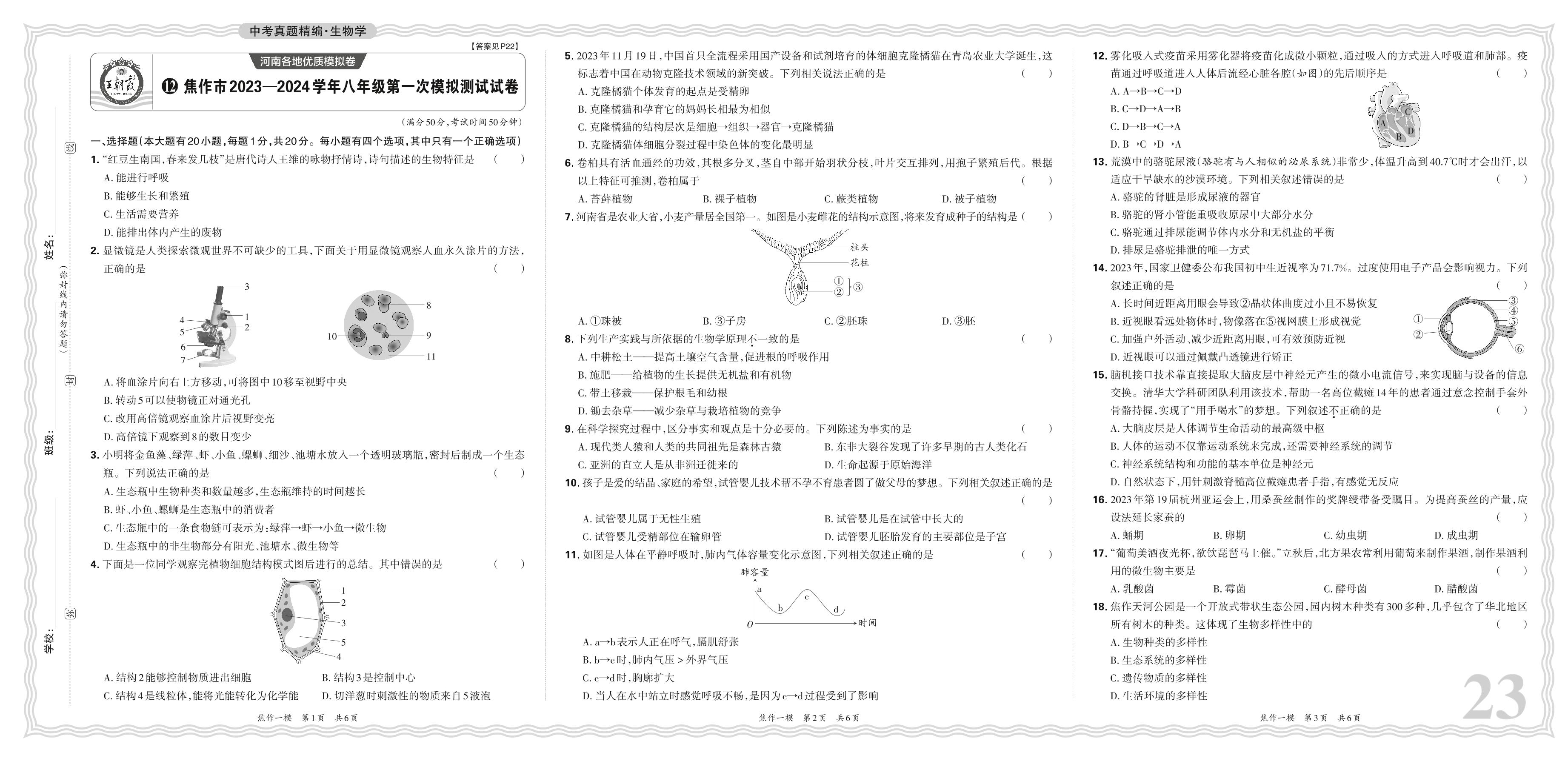 中考生物·河南省焦作市2023—2024学年八年级第一次模拟测试试卷【12】