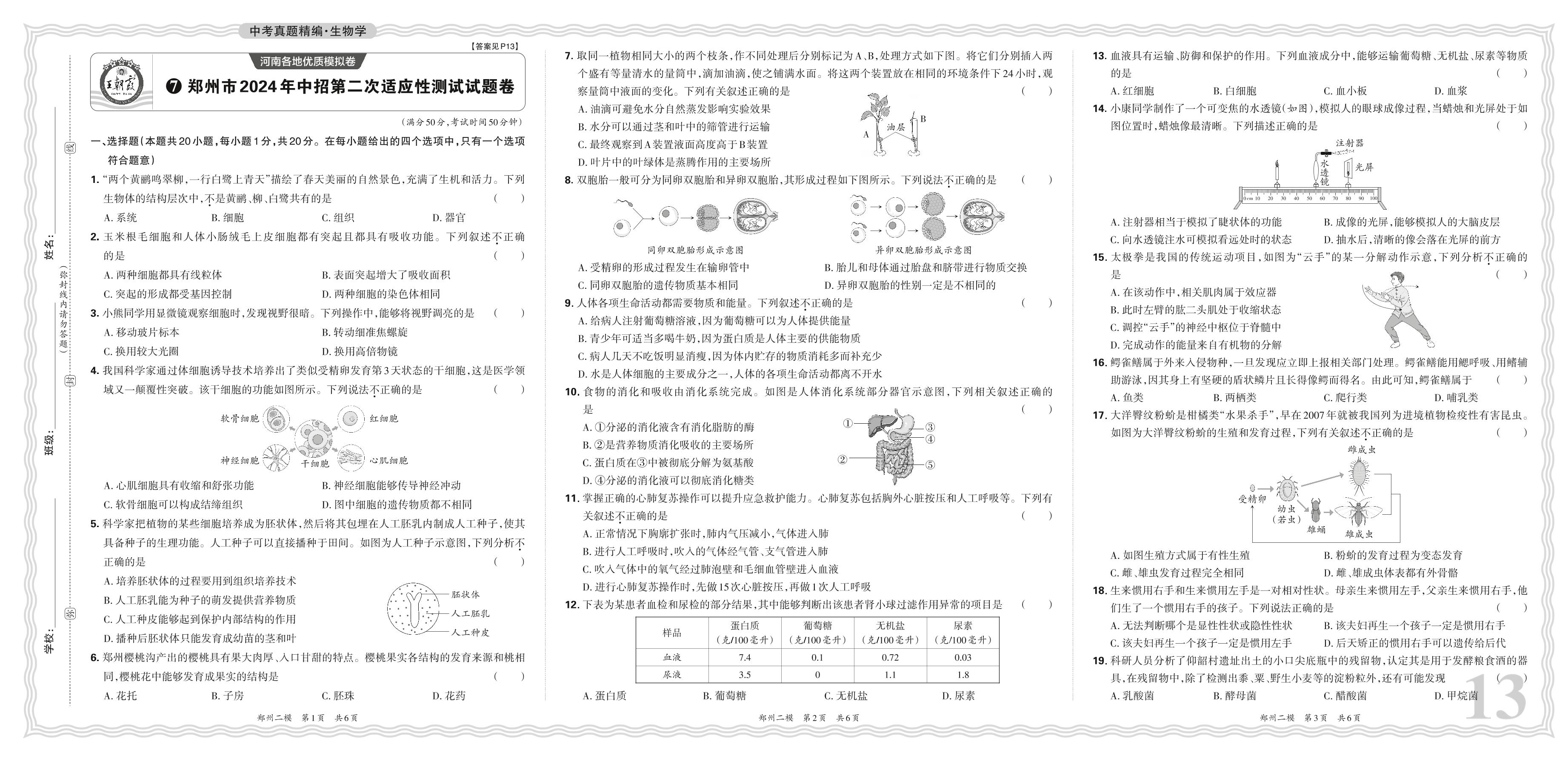 中考生物·河南省郑州市2024年中招第二次适应性测试试题卷【7】