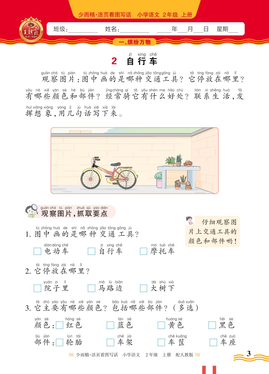 2024秋上册二年级语文人教版 看图写话一 缤纷万物——2. 自行车
