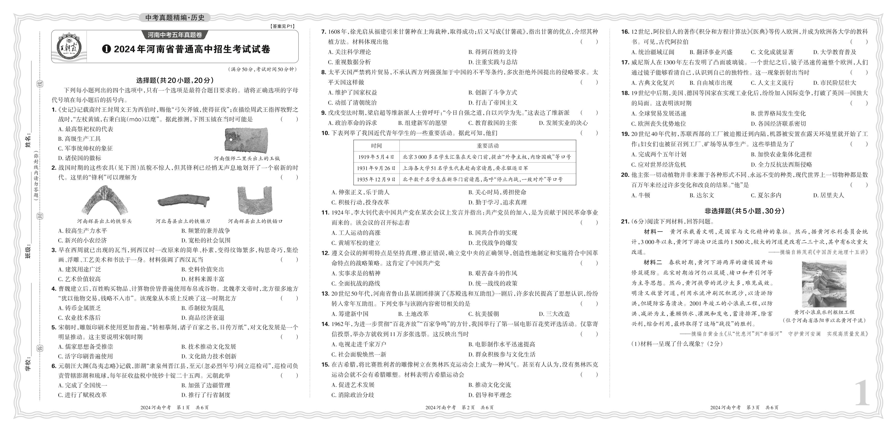 中考历史·2024河南省普通高中招生考试试卷【1】