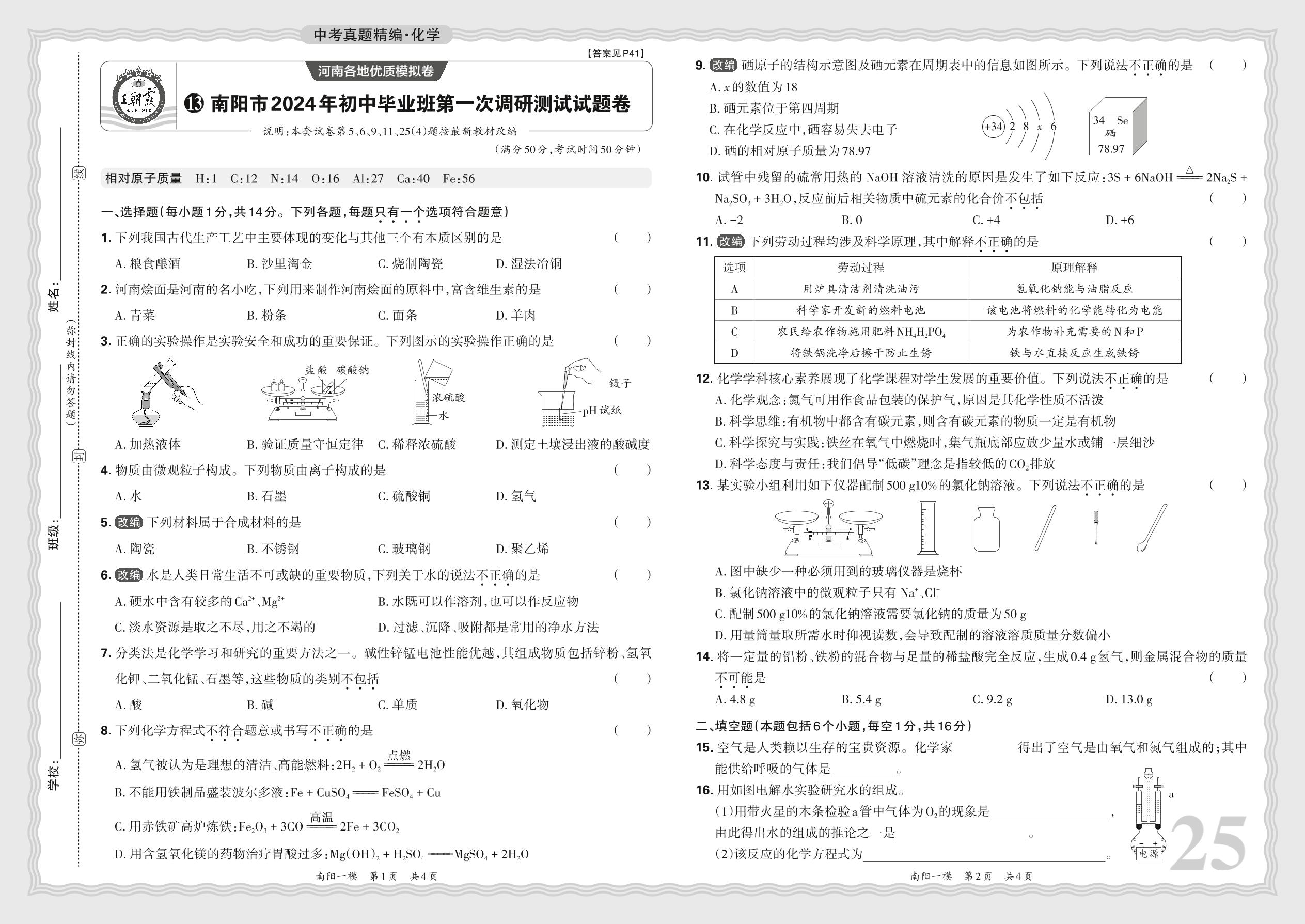 中考化学·河南省南阳市2024年初中毕业班第一次调研测试试题卷【13】