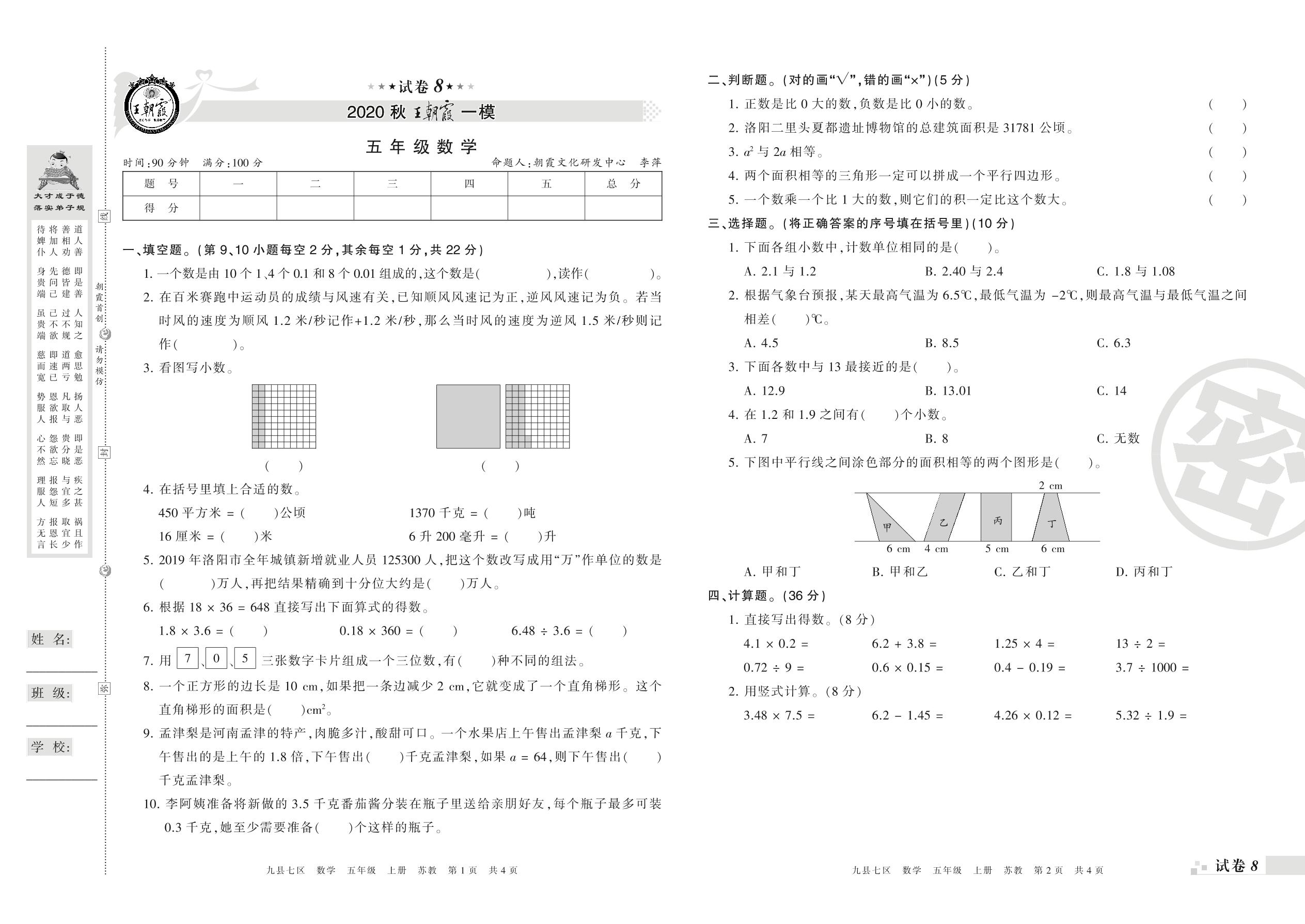 王朝霞期末模拟卷五年级上册数学(苏教版)【8】