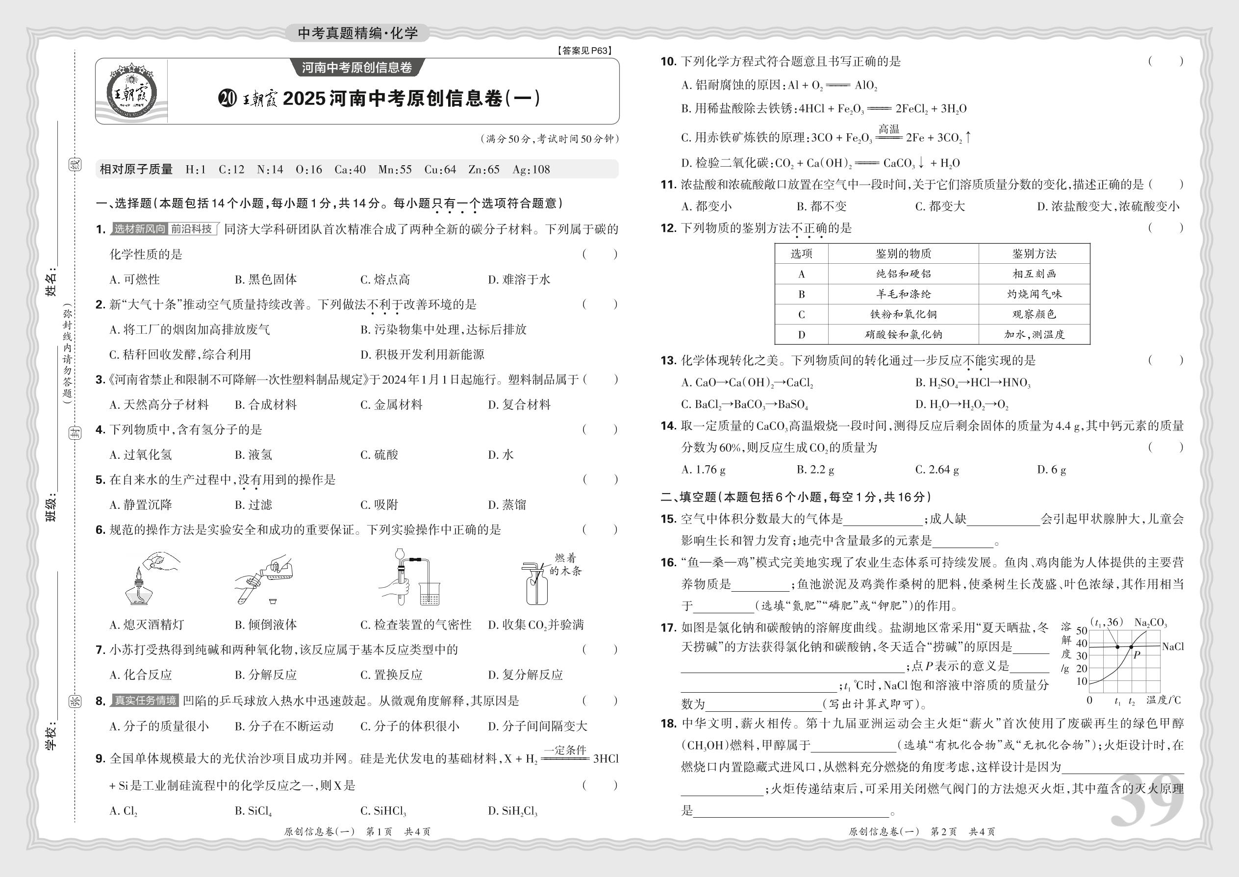 中考化学·王朝霞2025河南中考原创信息卷(一)【20】