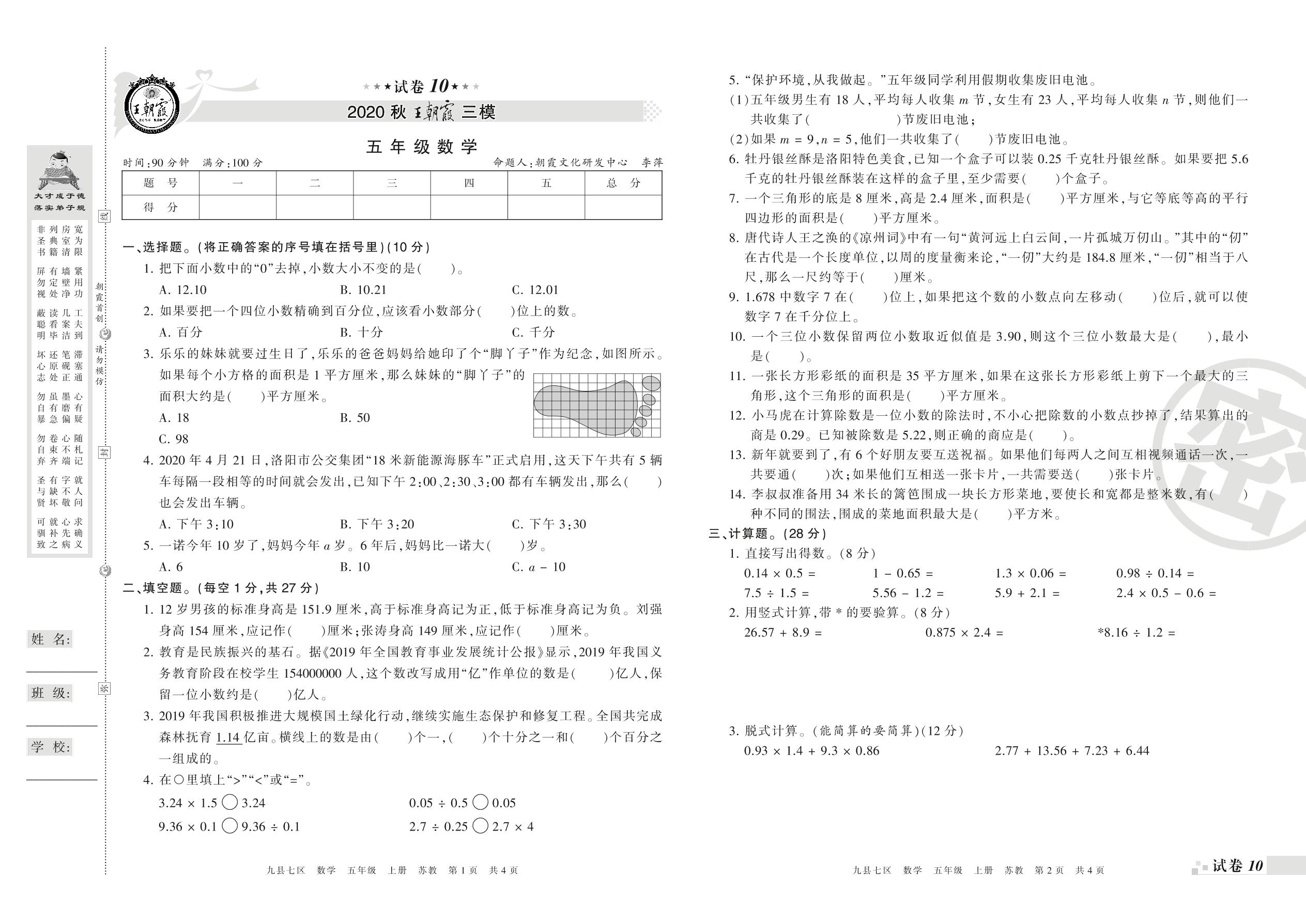 王朝霞期末模拟卷五年级上册数学(苏教版)【10】