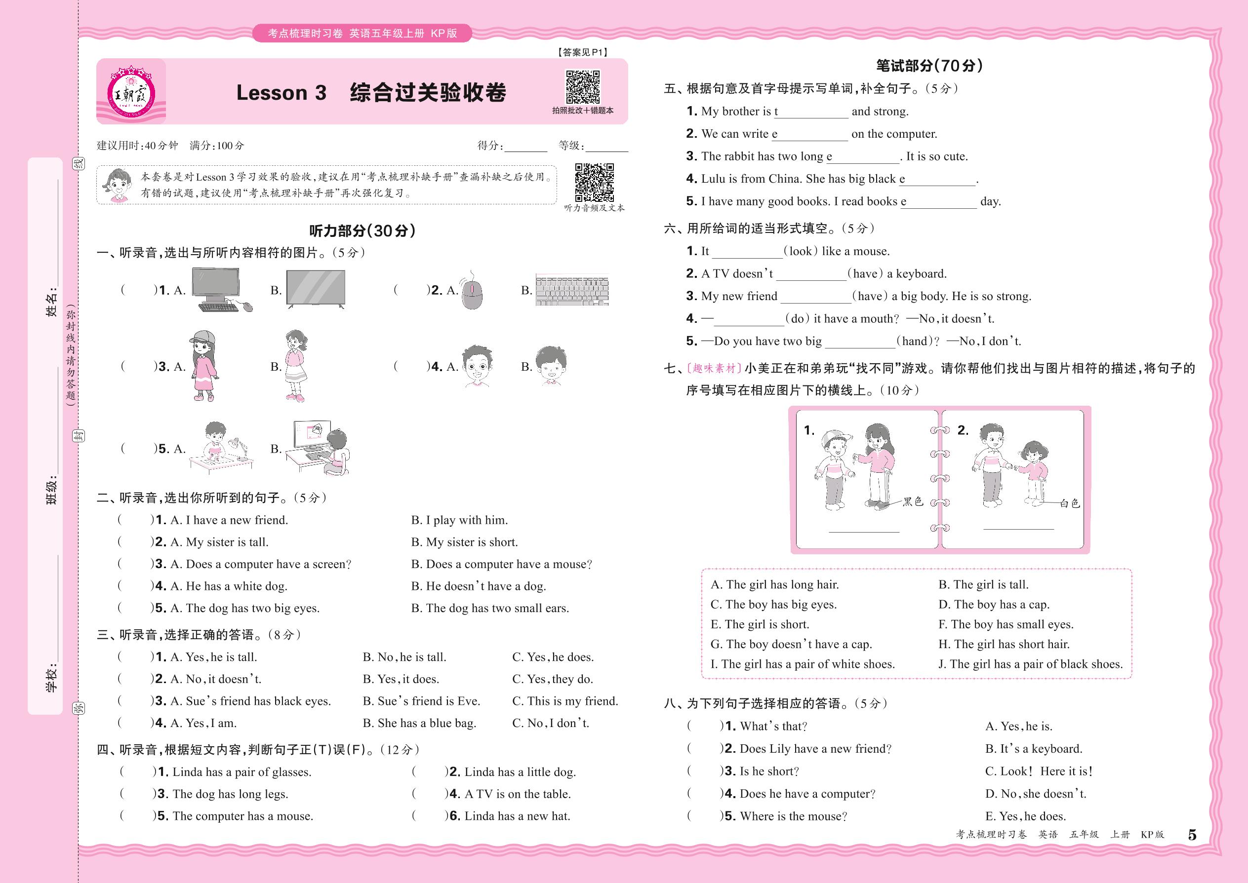 2024秋上册五年级英语科普版 Lesson 3 综合过关验收卷