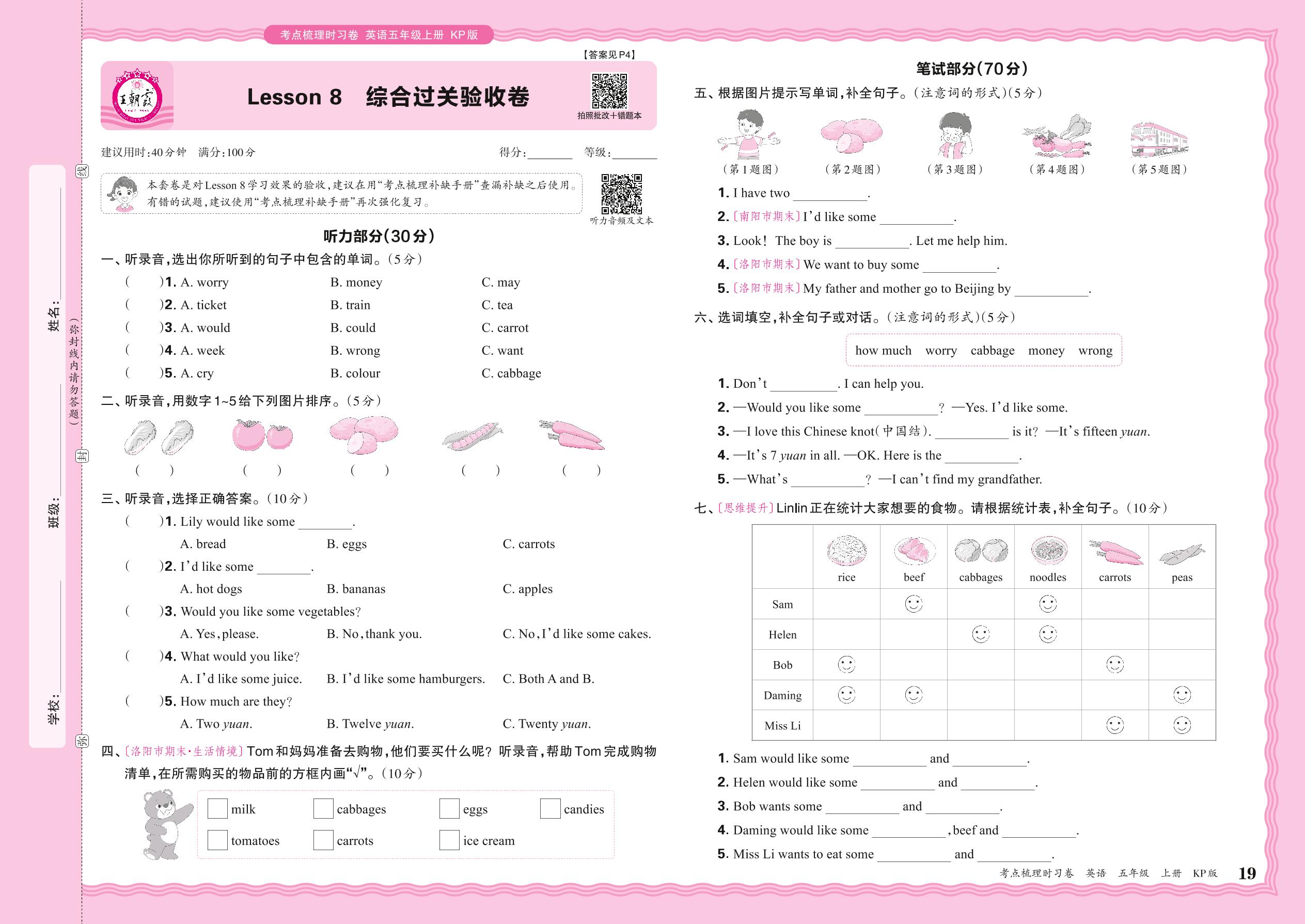 2024秋上册五年级英语科普版 Lesson 8 综合过关验收卷