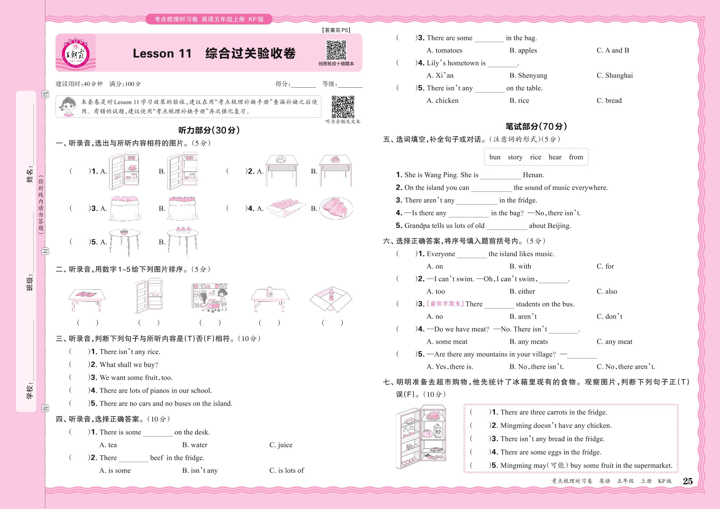 2024秋上册五年级英语科普版 Lesson 11 综合过关验收卷