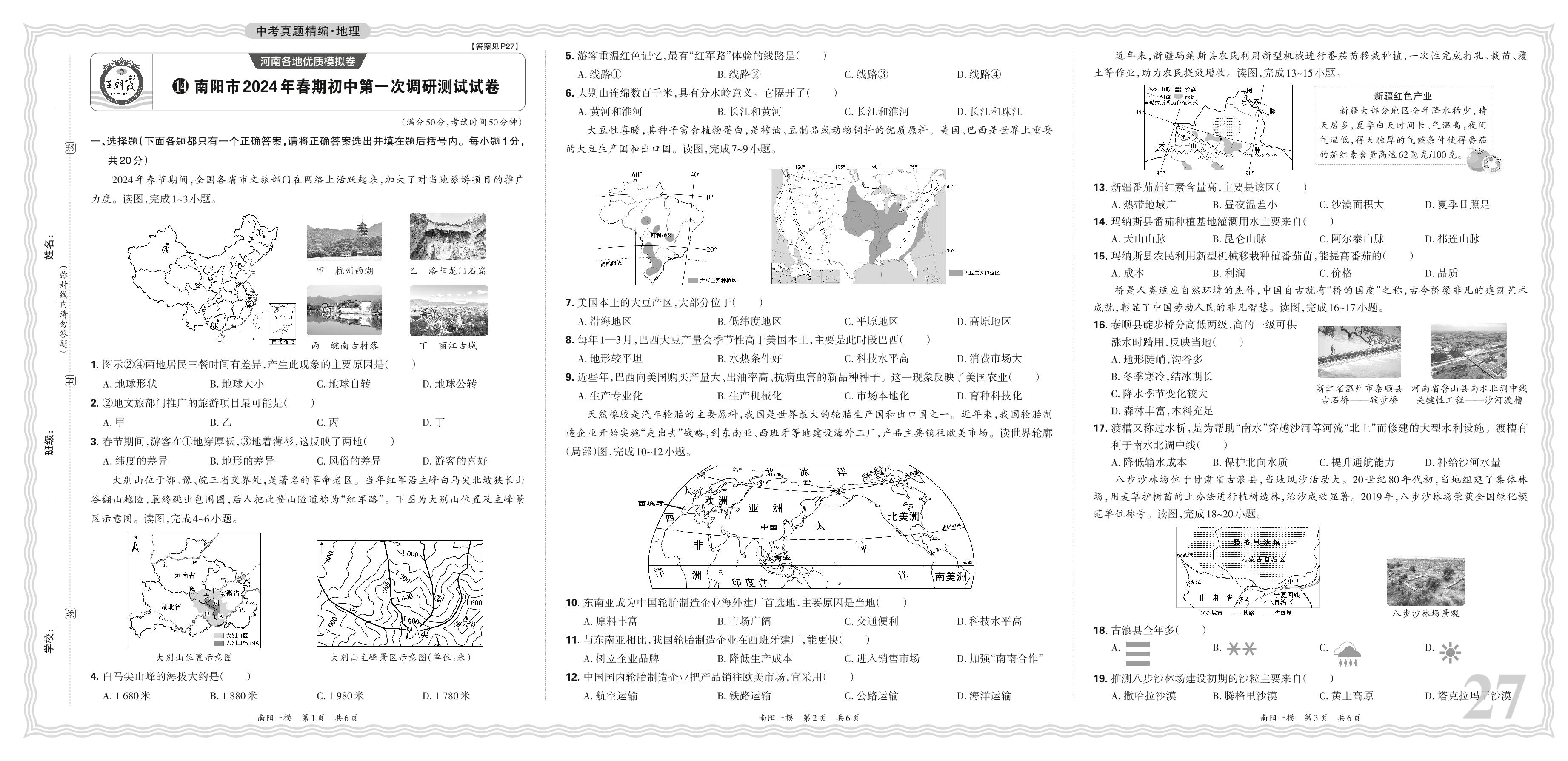 中考地理·河南省南阳市2024年春期初中第一次调研测试试卷【14】