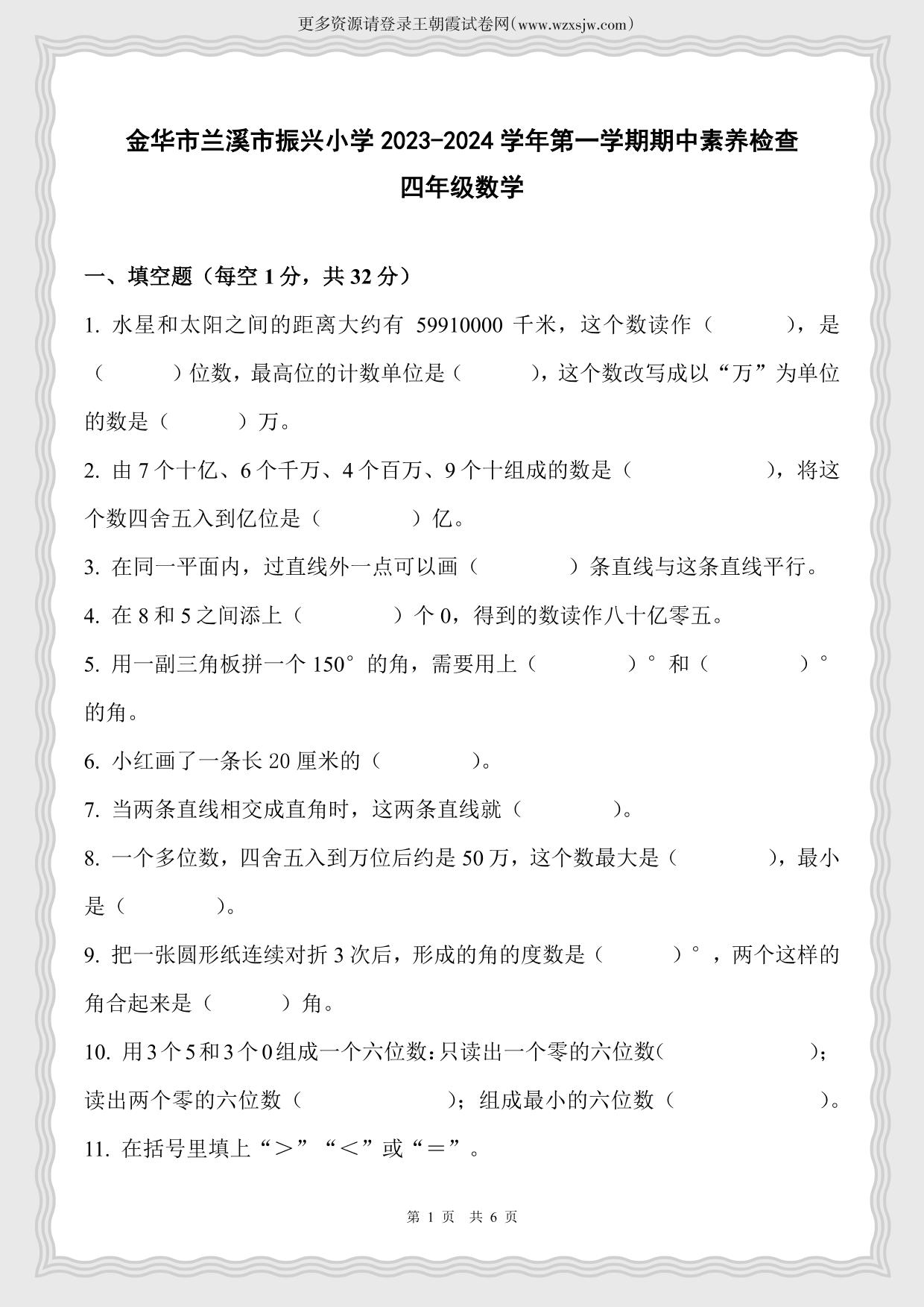 浙江省金华市兰溪市振兴小学2023-2024学年第一学期期中素养检查四年级数学(北师版)
