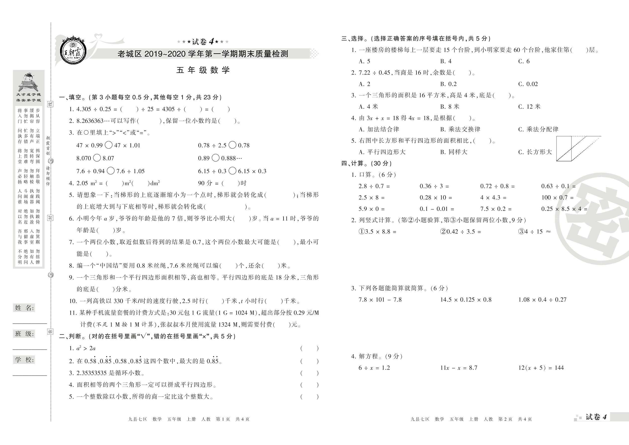 2019-2020学年第一学期洛阳市老城区五年级数学试卷(人教版)【4】
