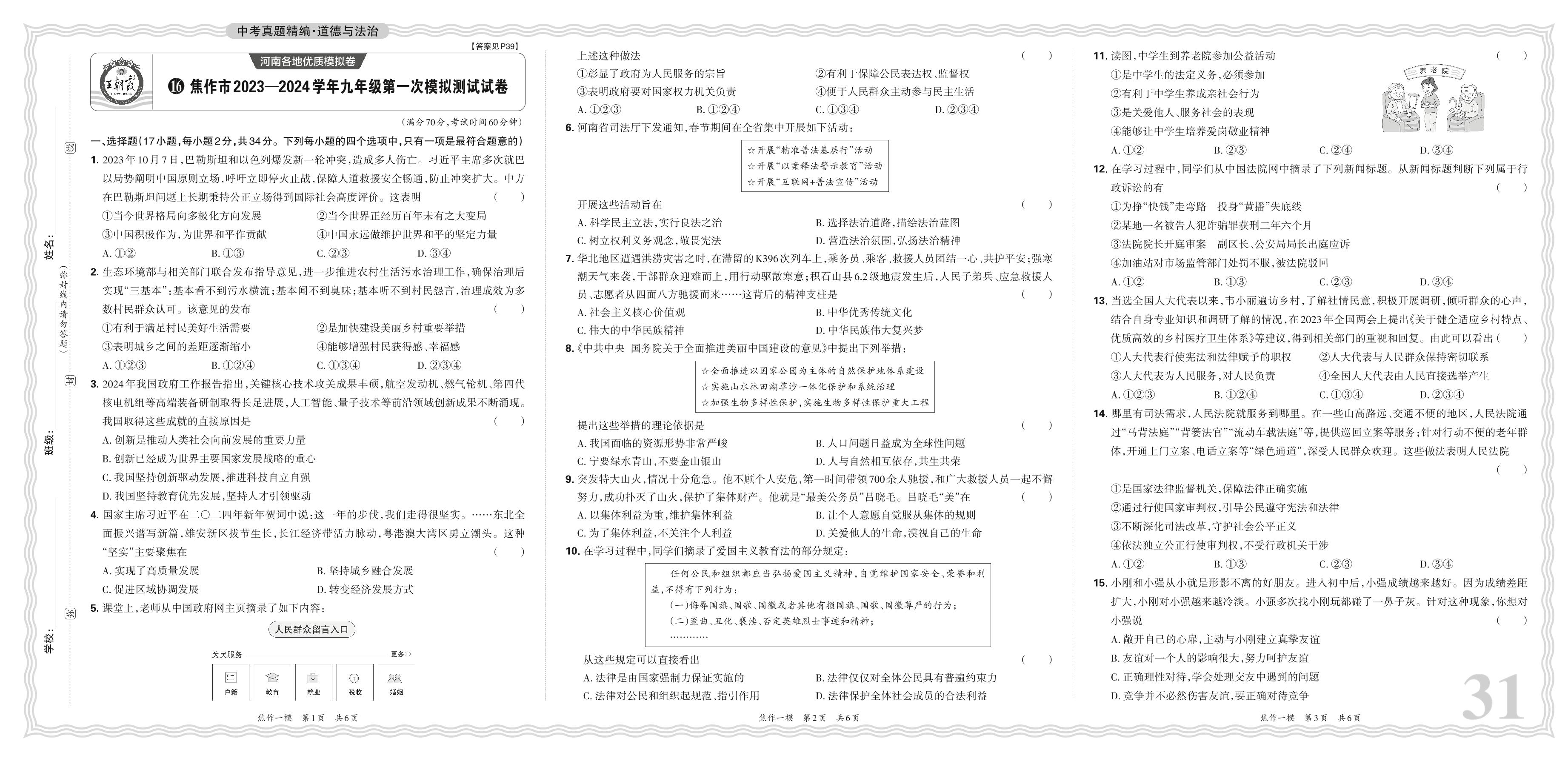 中考道德与法治·河南省焦作市2023—2024学年九年级第一次模拟测试试卷【16】
