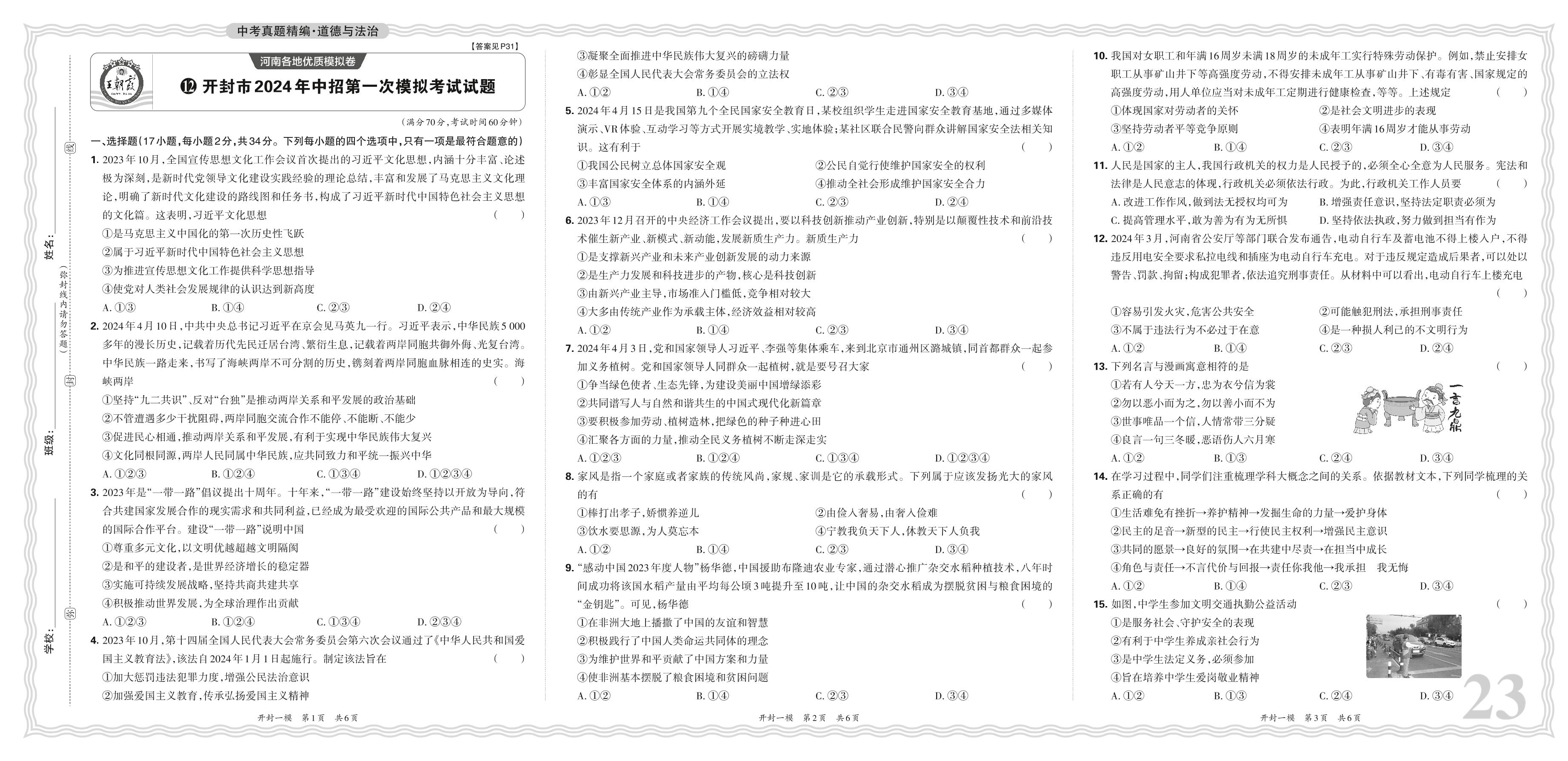 中考道德与法治·河南省开封市2024年中招第一次模拟考试试题【12】