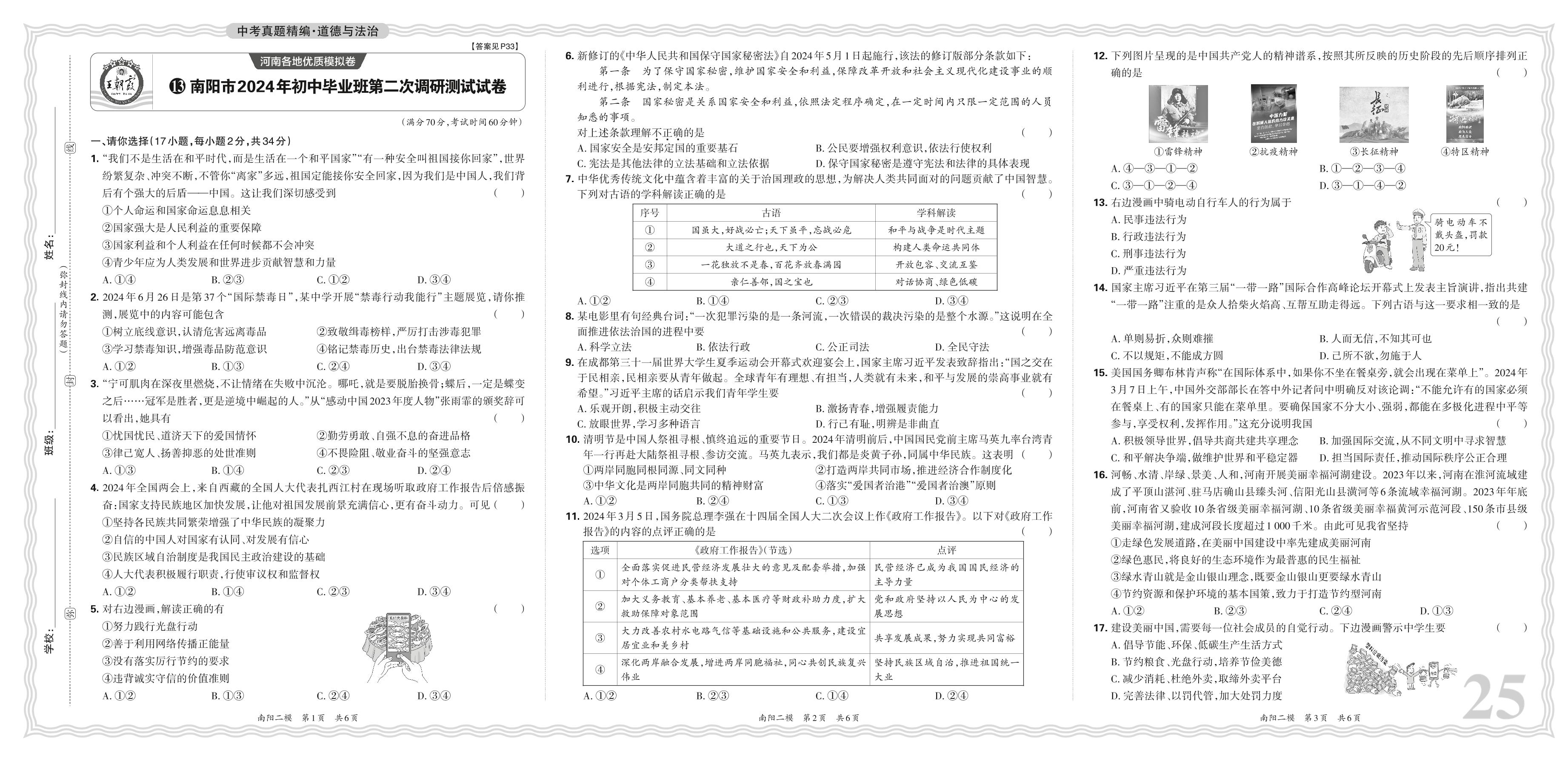 中考道德与法治·河南省南阳市2024年初中毕业班第二次调研测试试卷【13】