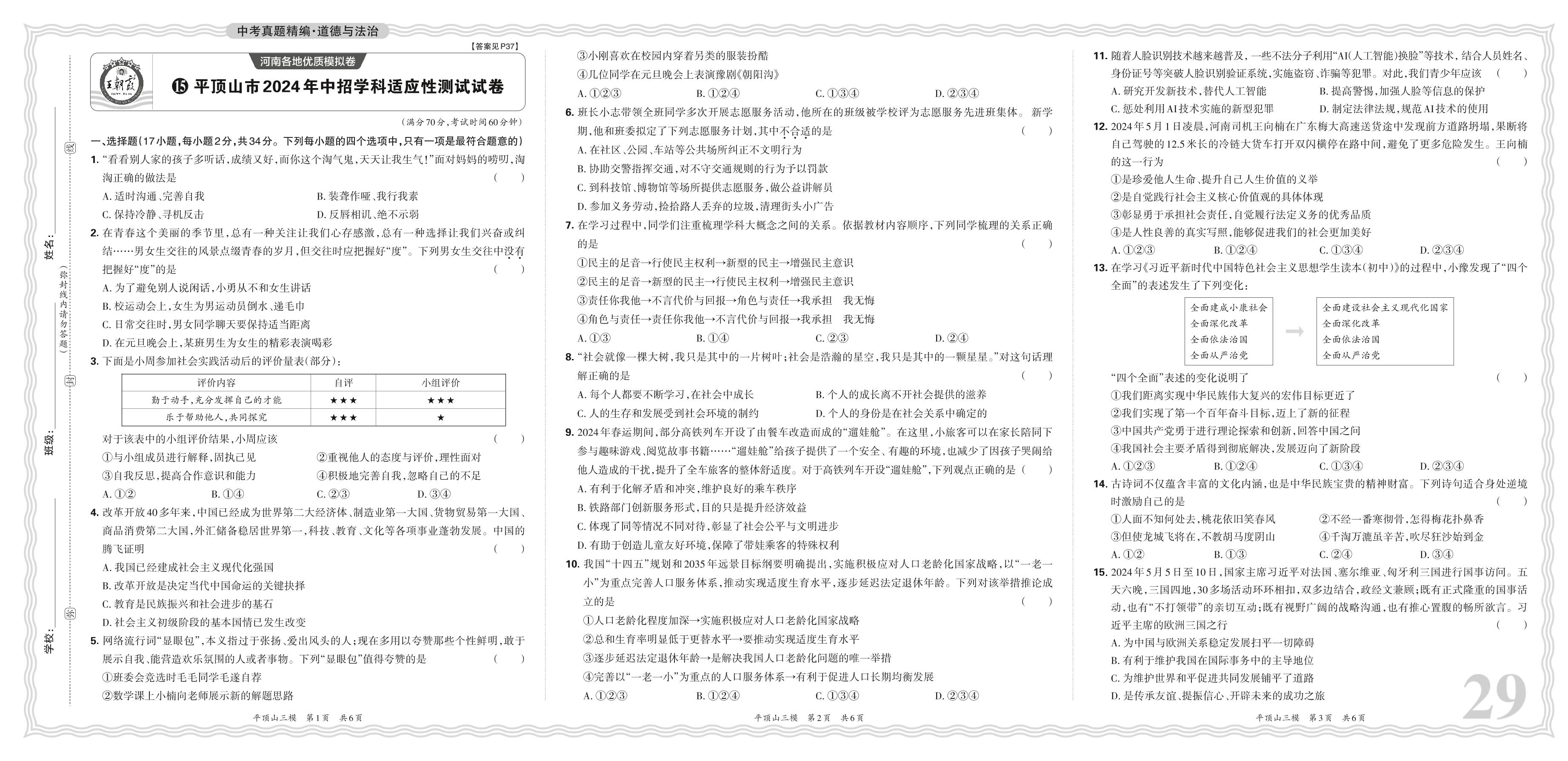 中考道德与法治·河南省平顶山市2024年中招学科适应性测试试卷【15】