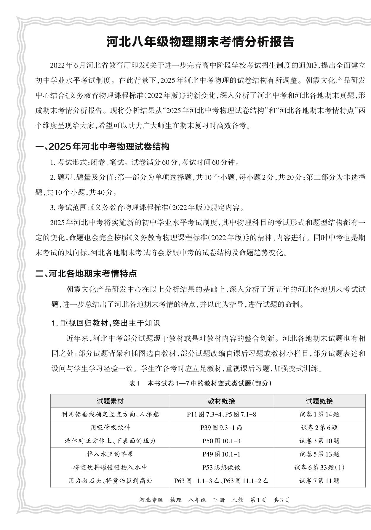 初中物理人教版八年级期末考情分析报告(2024春河北)