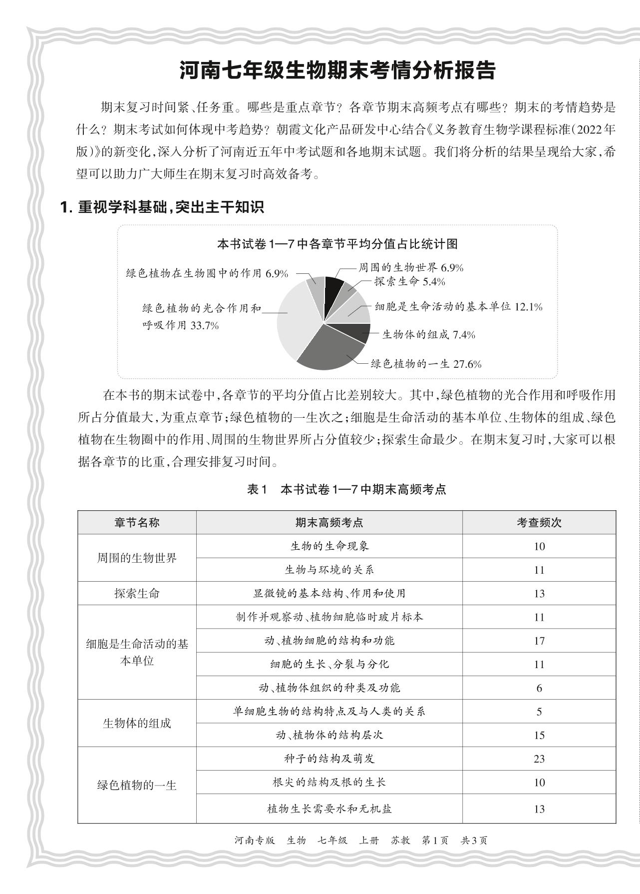 七年级生物苏教版上册考情分析