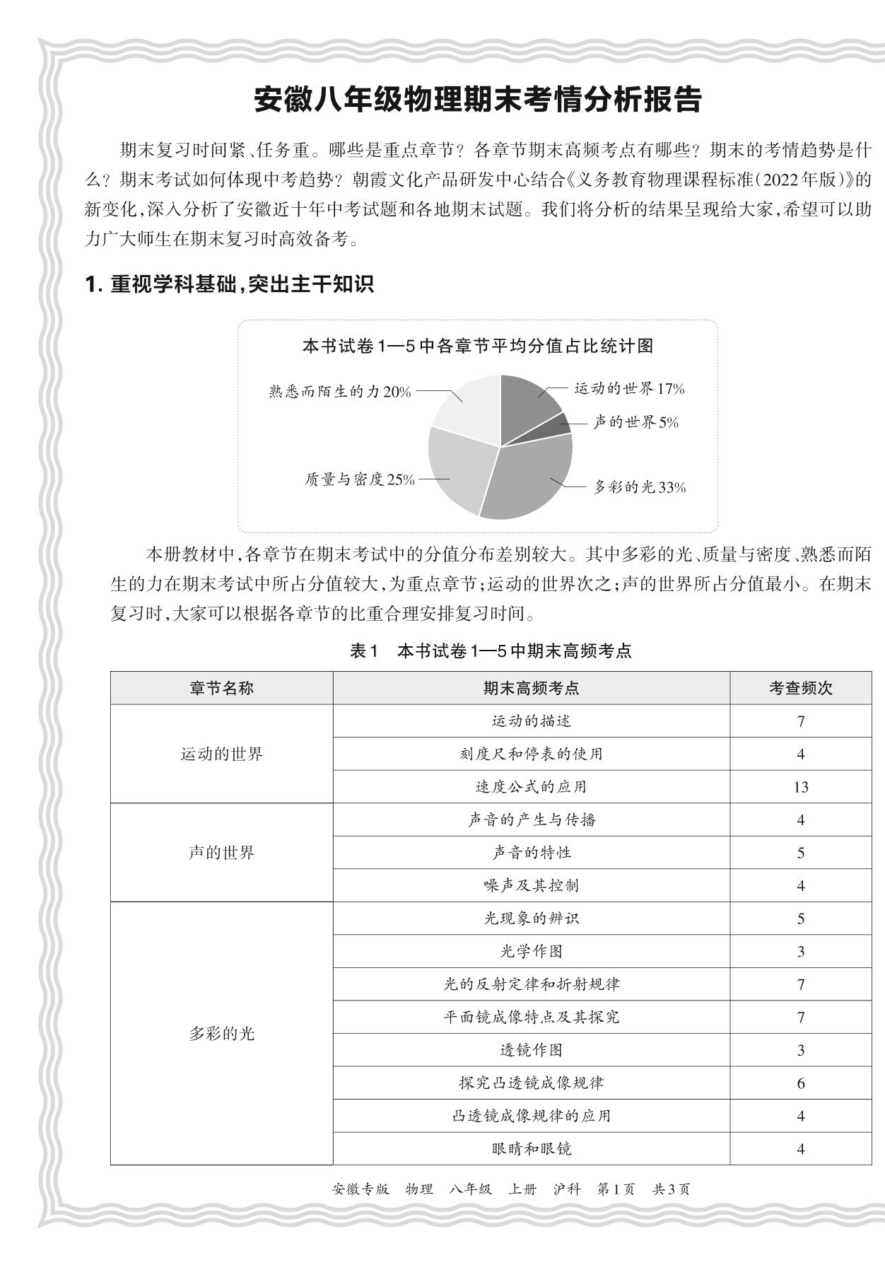 初中物理沪科版八年级期末考情分析报告(2023秋安徽)