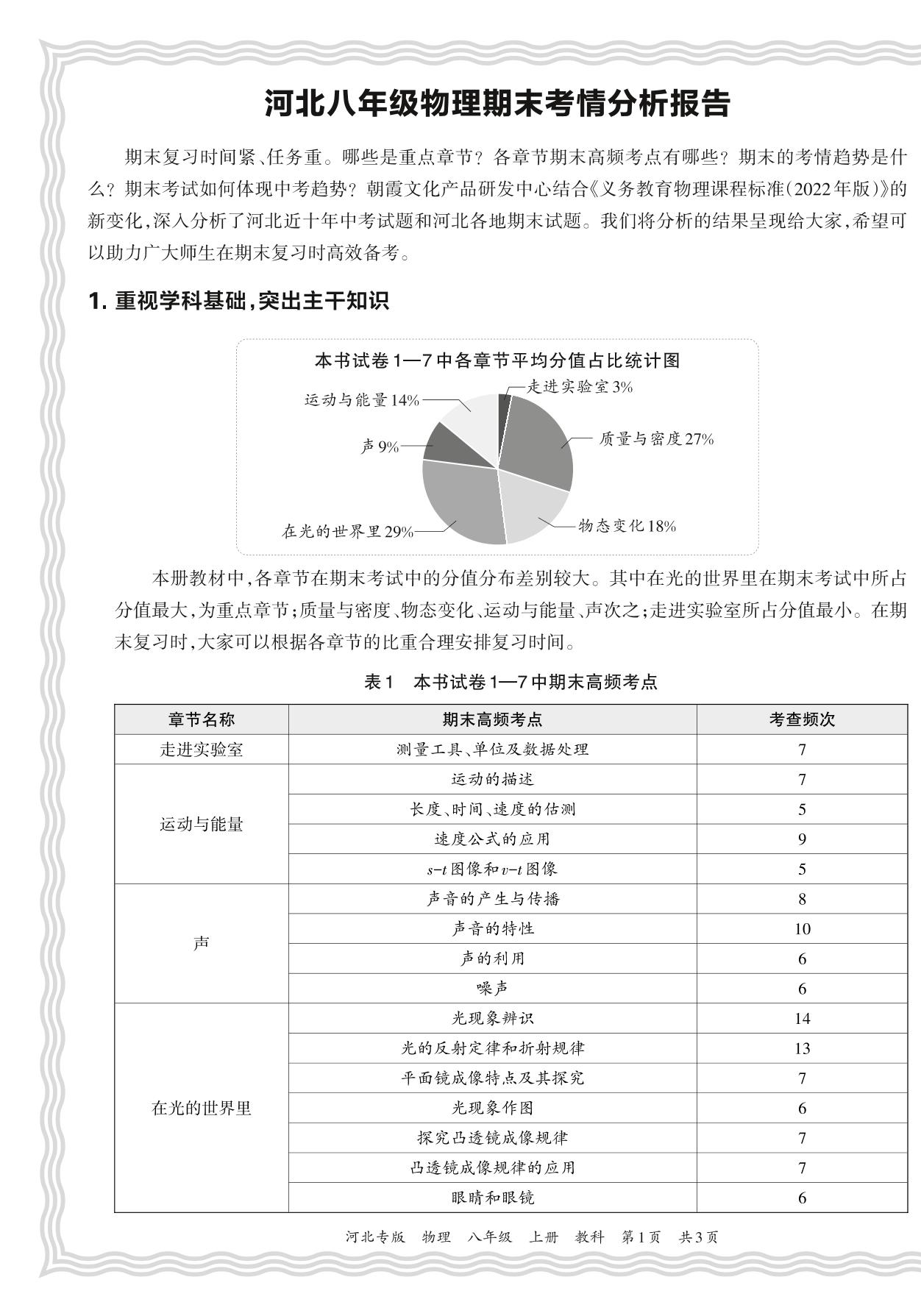 初中物理教科版八年级期末考情分析报告(2023秋河北)