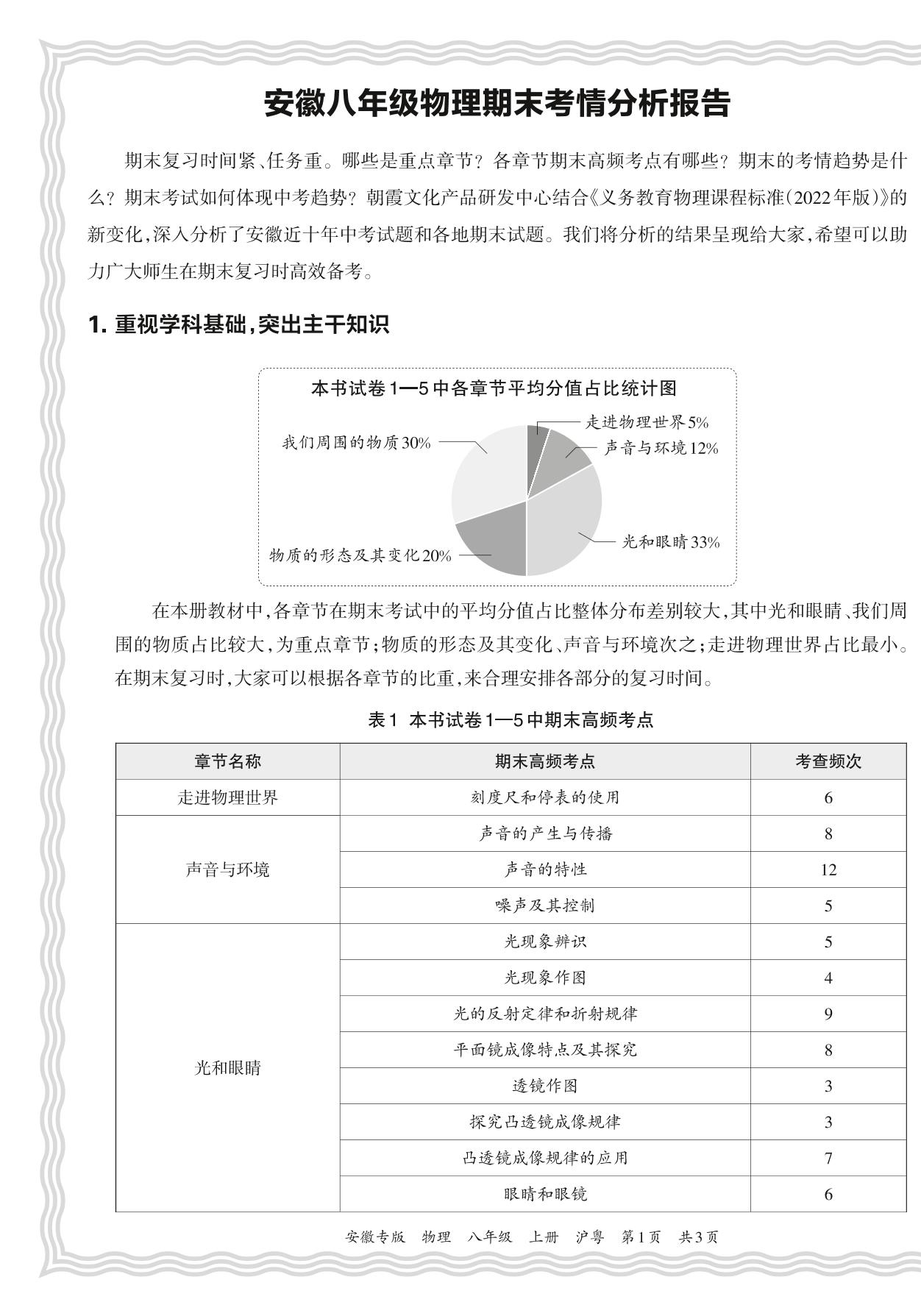 初中物理沪粤版八年级期末考情分析报告(2023秋安徽)