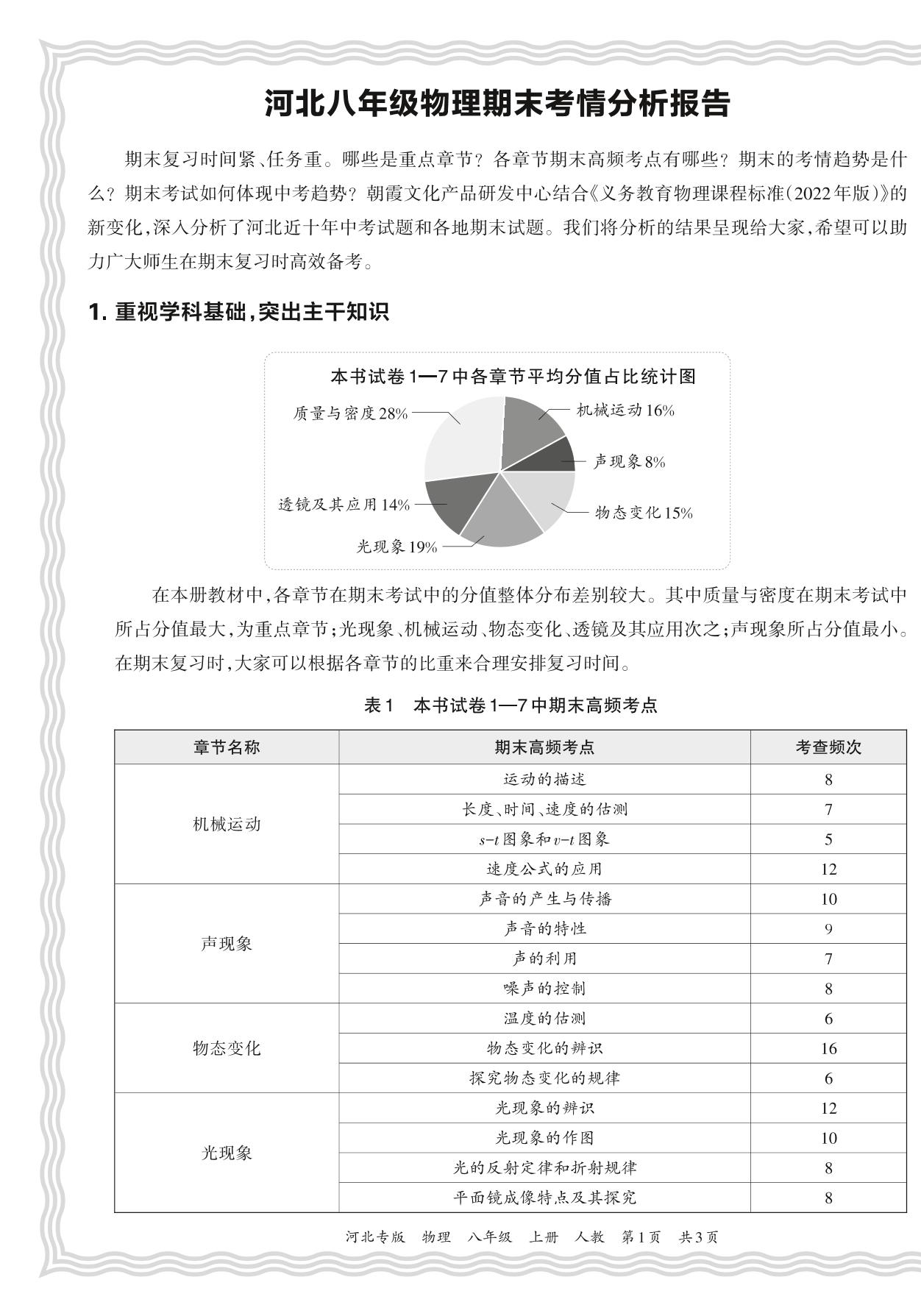 初中物理人教版八年级期末考情分析报告(2023秋河北)