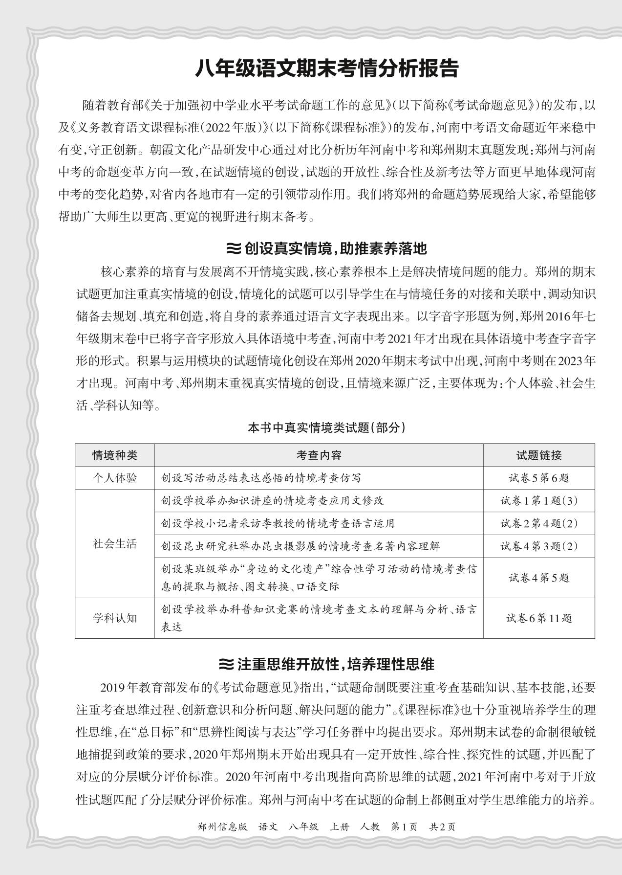初中语文人教版八年级期末考情分析报告(2023秋郑州)