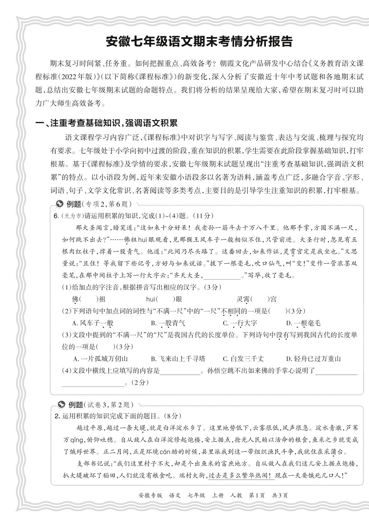初中语文人教版七年级期末考情分析报告(2023秋安徽)