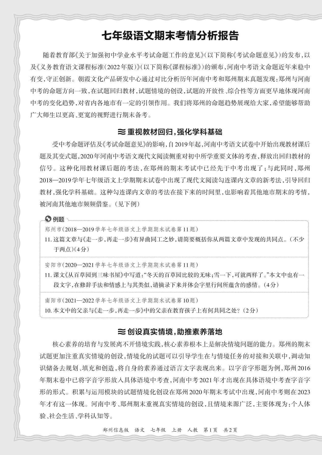 初中语文人教版七年级期末考情分析报告(2023秋郑州)