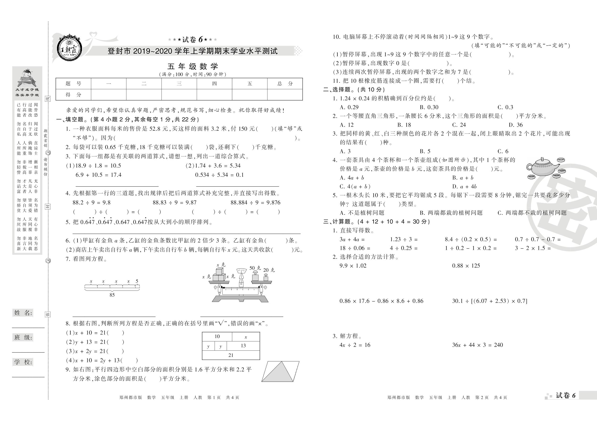 2019-2020学年第一学期登封市五年级数学试卷(人教版)【6】