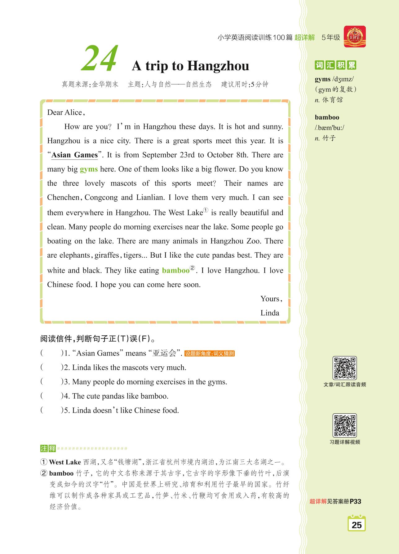 五年级英语阅读超详解 Part1 青铜篇:24 A trip to Hangzhou